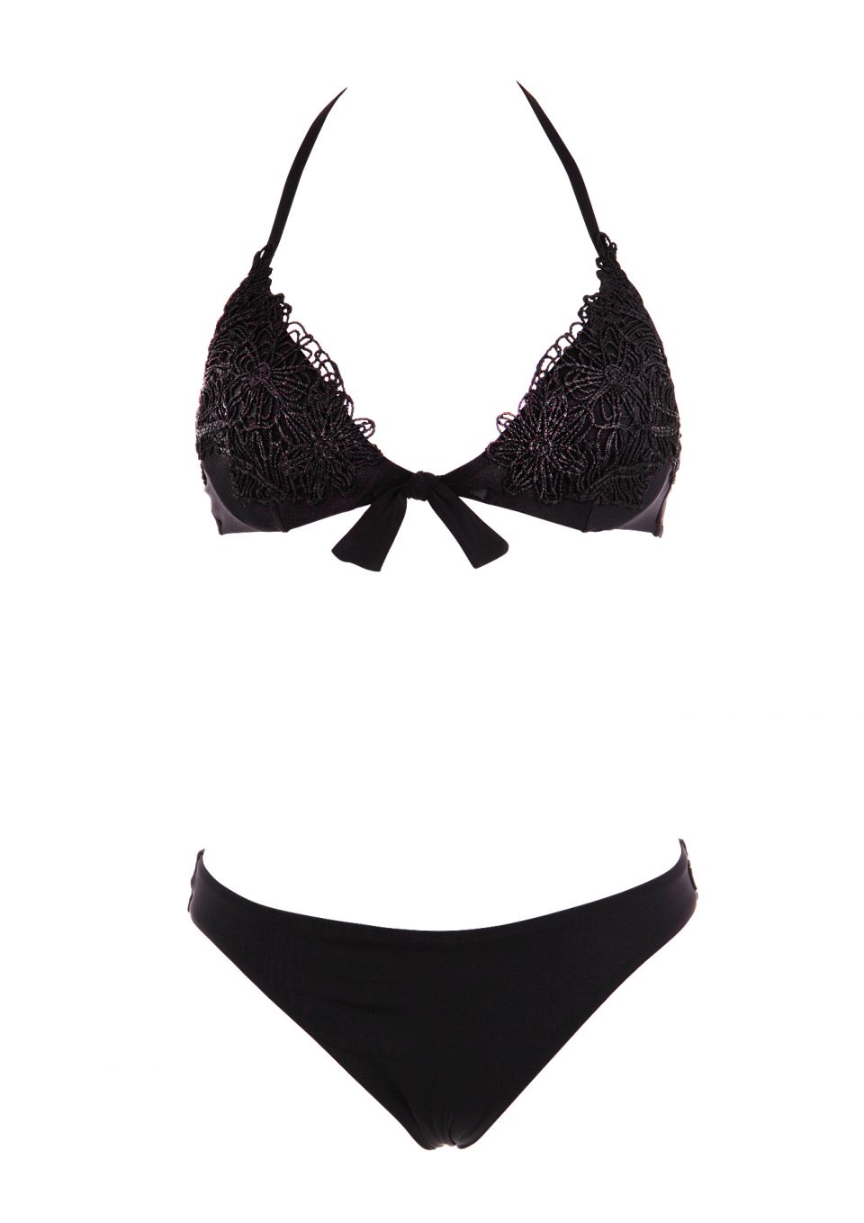 Stylish and chic, this underwired halter bikini top has beautiful crochet lace overlay on the cups and a flattering plunge neckline.