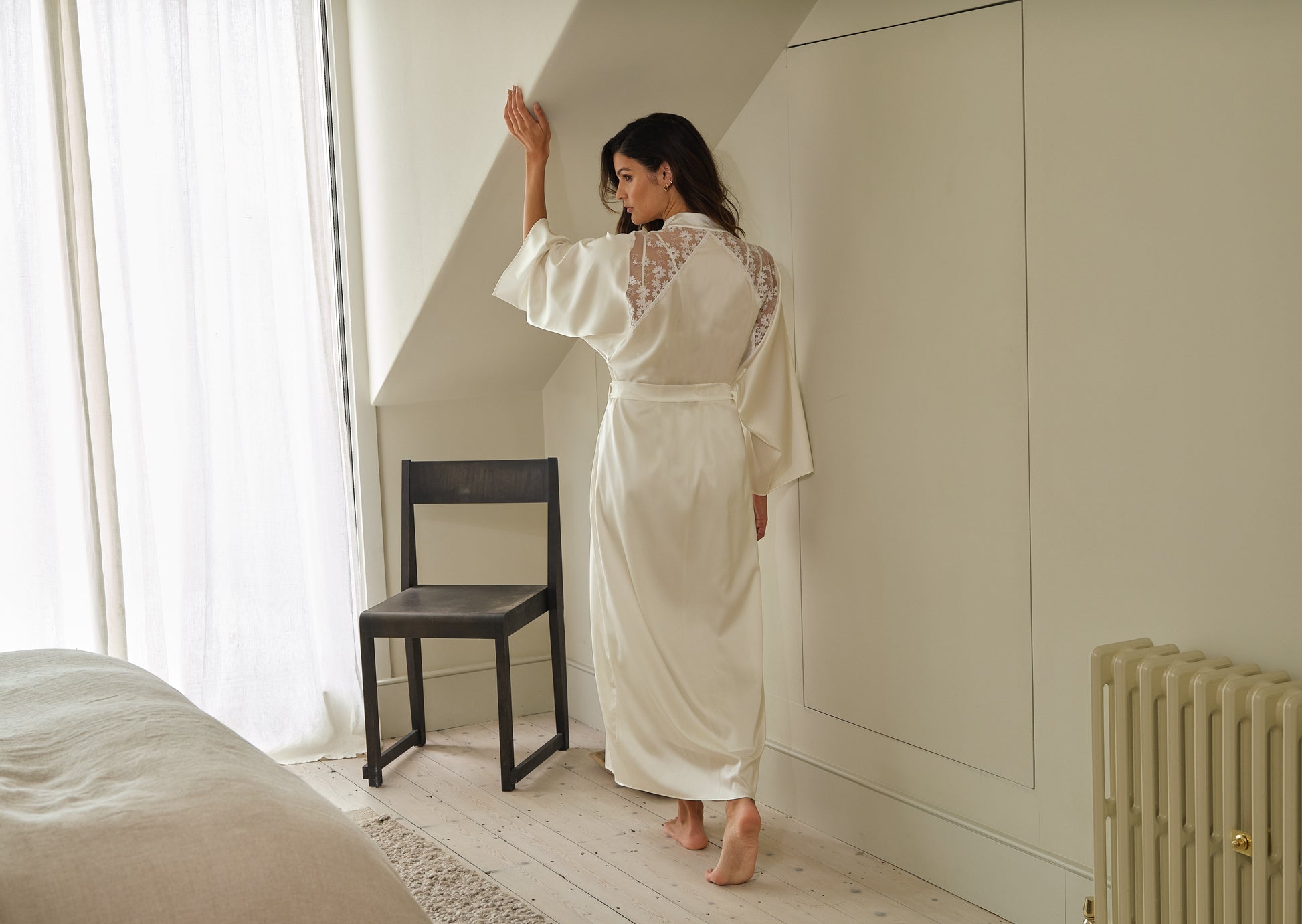 The Daisy silk dress is an update to the classic Fleur of England Babydoll design. The midi length slip dress is crafted in silk 90% with added 10% for a luxuriously soft feel. Embroidered elegant daisy design onto soft recycled tulle base adorn the soft cups. Silk encased, double elastic straps are paired with 24-carat gold plated rings and sliders, leading to a backless design with panels of embroidery providing coverage to the side of the body.
