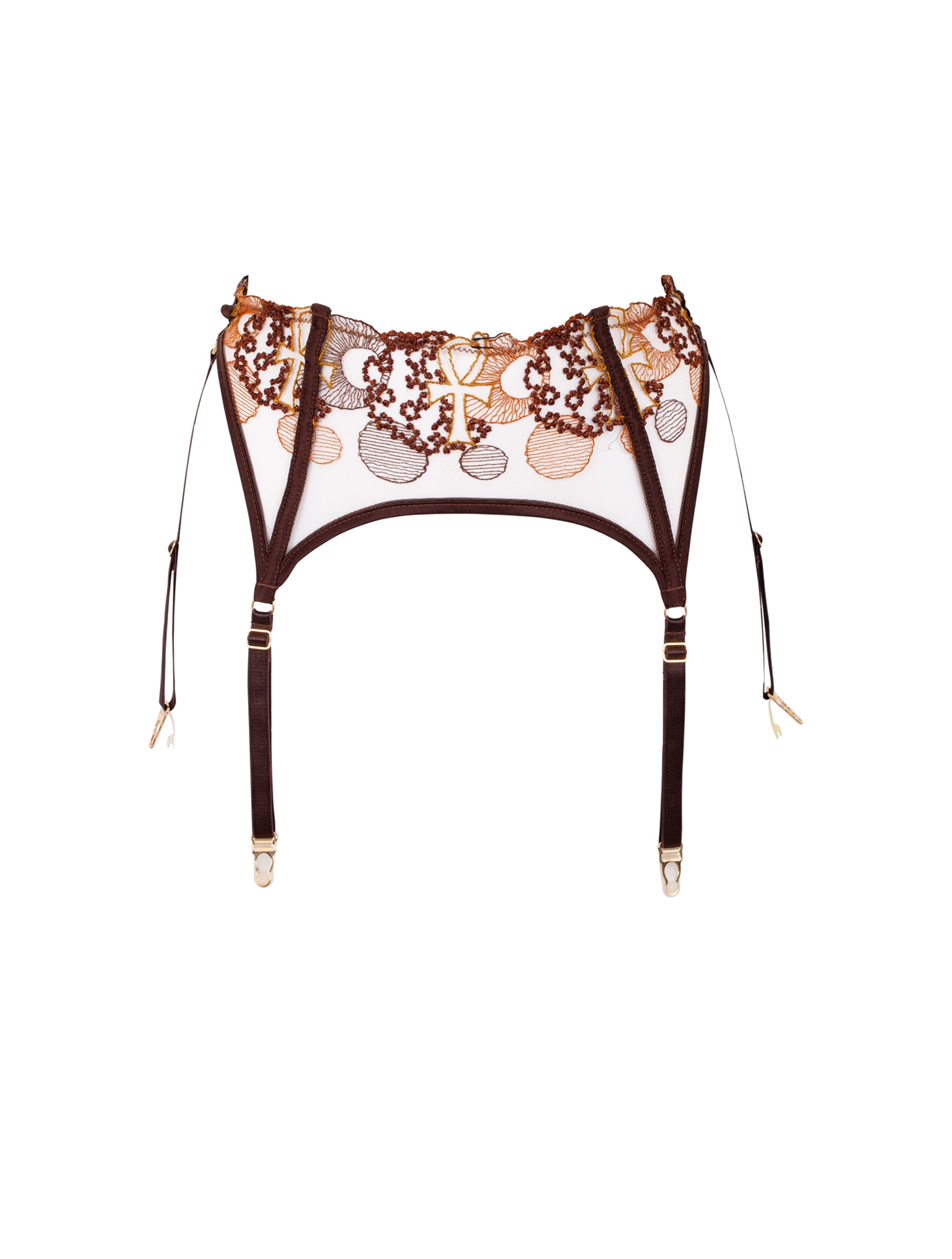 Luxuriate in the decadent Ankh bespoke embroidery and delicate chocolate silk encasing your hips. I am the perfect finishing touch to your lingerie set. With fully adjustable elastic strapping, offering a really personalised fit and 6 suspender straps for added security, but if you’re an aficionado with the suspender belt, 2 straps are detachable. Gold plated clasp at the back finishes my look.