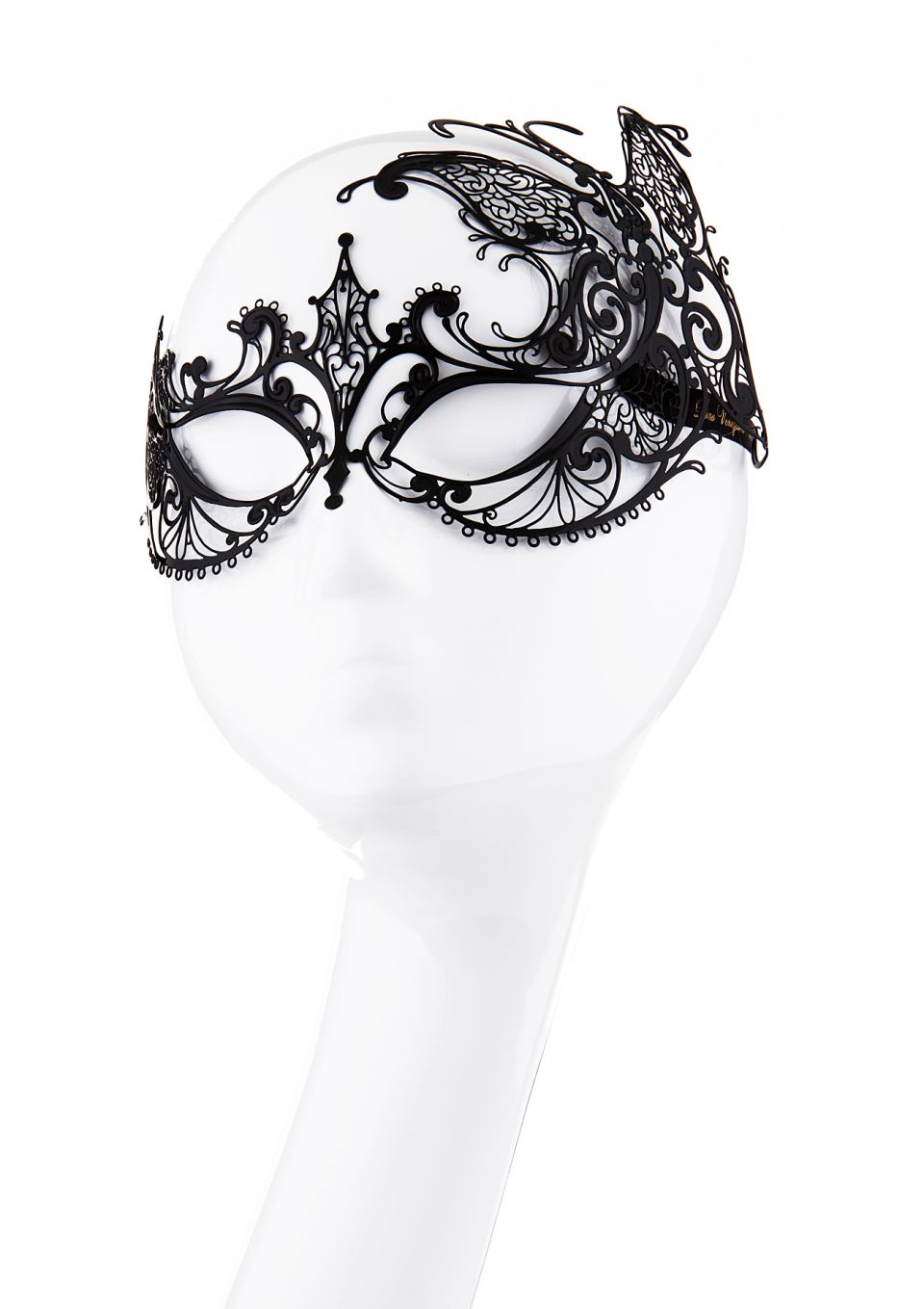 A decadent and daring eyemask in filigree metal with a glass black finish. This magnificent eyemask features an asymmestric butterfly design and is sure to make an impact.