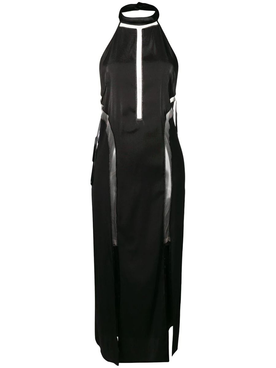 Black silk stretch Isabelle long night dress from Parah featuring a halter neck, an open back, a sleeveless design and a mid-length.