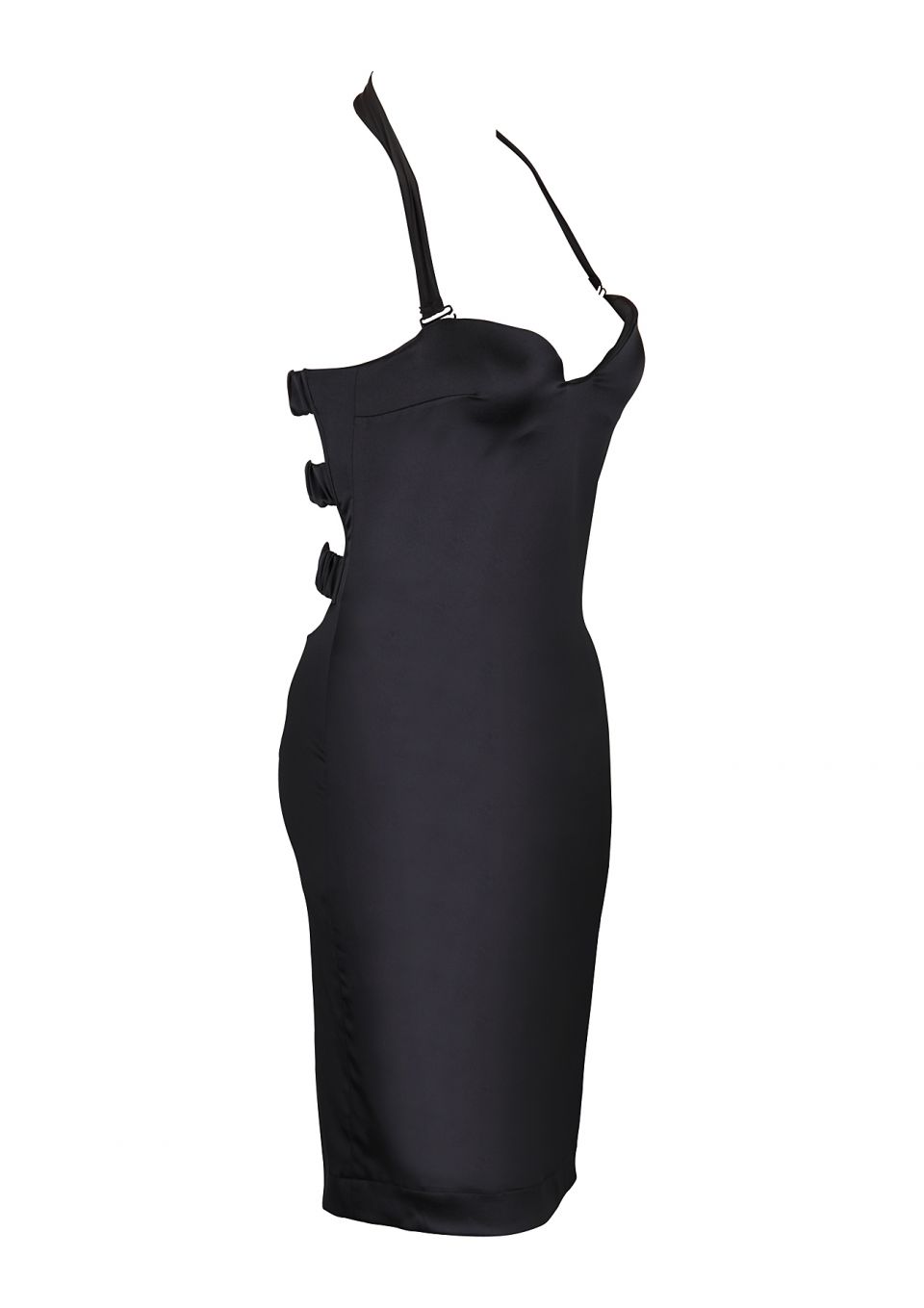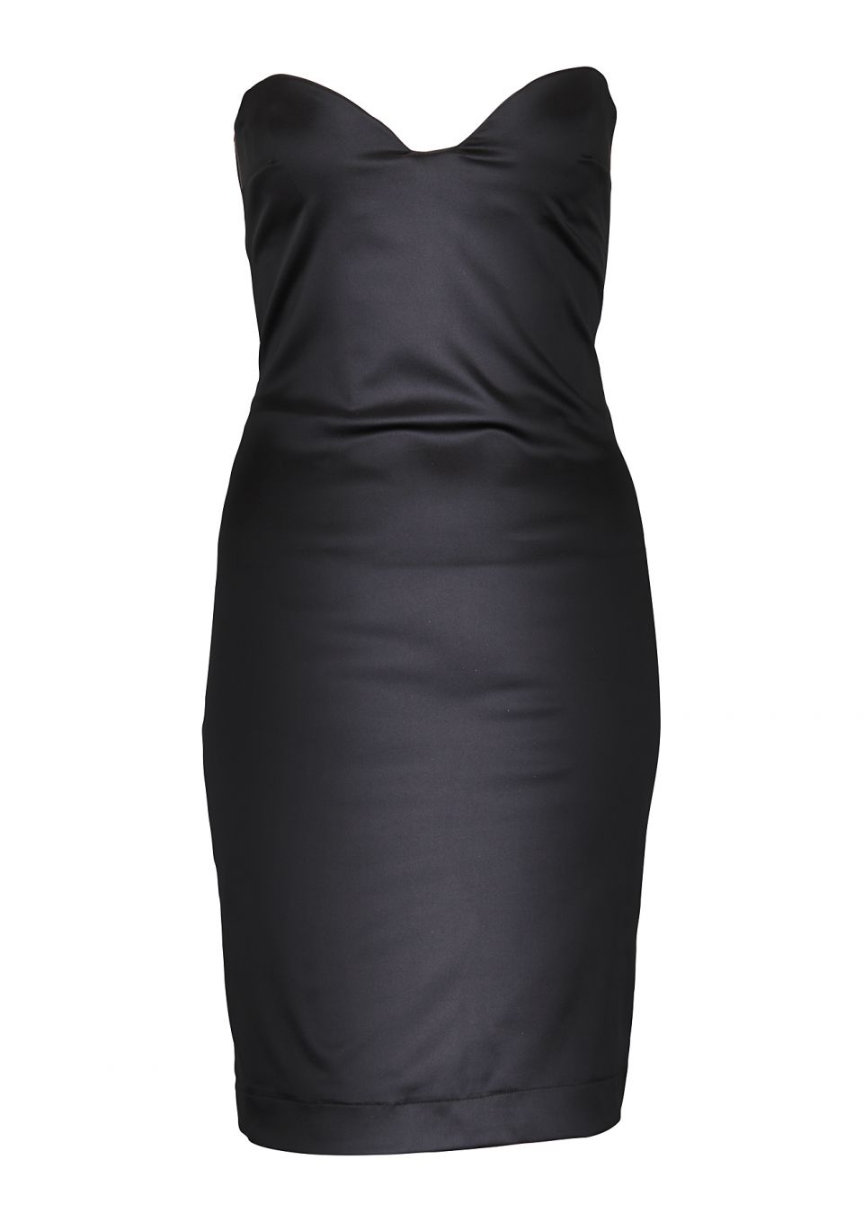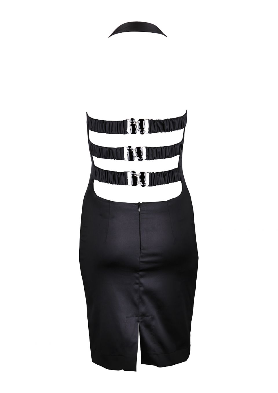 Dolci Follie's very own exclusive dress in black silk satin has a stunning sweetheart neck line, this simple yet stylish knee length dress has a classic shape and figure hugging cut, featuring a low cut back and three elasticated straps with a luxurious fastener. Includes a halter neck strap for maximum support if wanted.