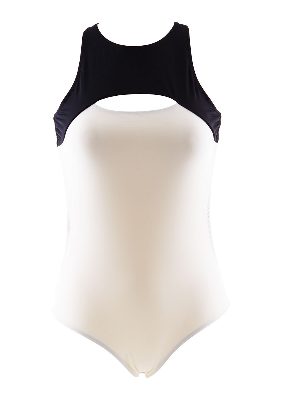 A gorgeous monochrome swimsuit with an on-trend Sports Luxe style. This ivory and black swimsuit has a contrasting neckline with a chic cut-out at the chest. The back is cut away leaving simply two cross-over black straps and ivory hipster bottoms.