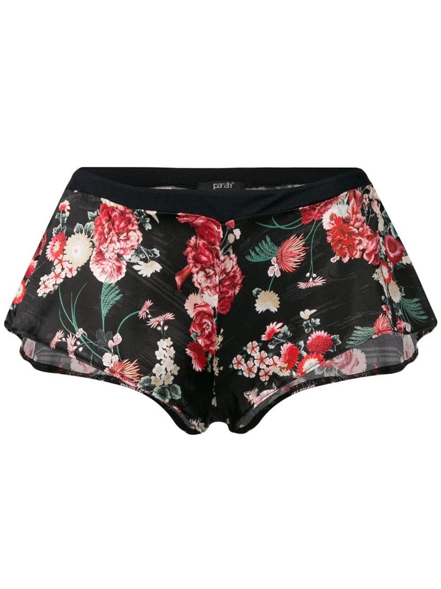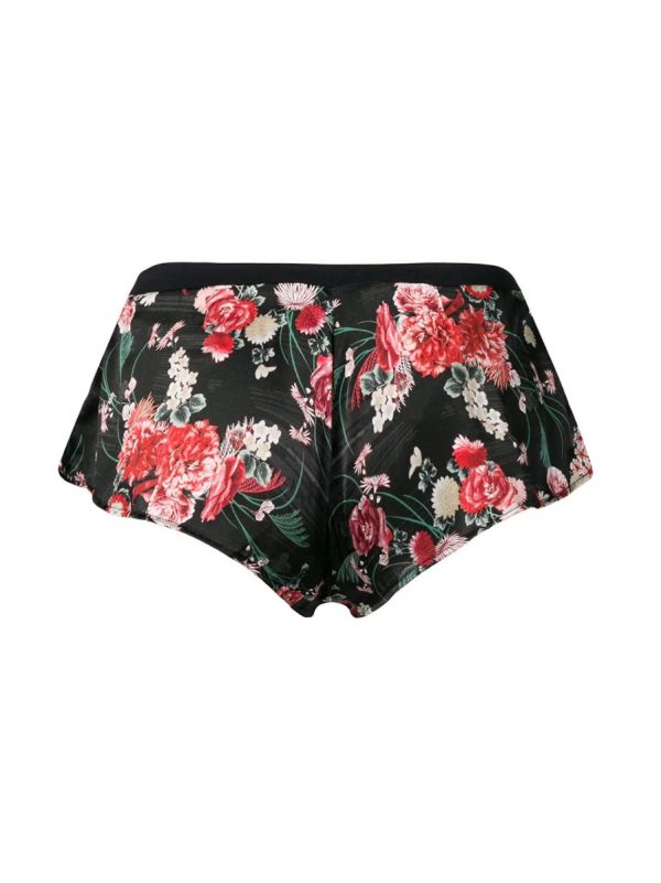 Black silk stretch Kim french knickers from Parah featuring an elasticated waistband and a floral print.