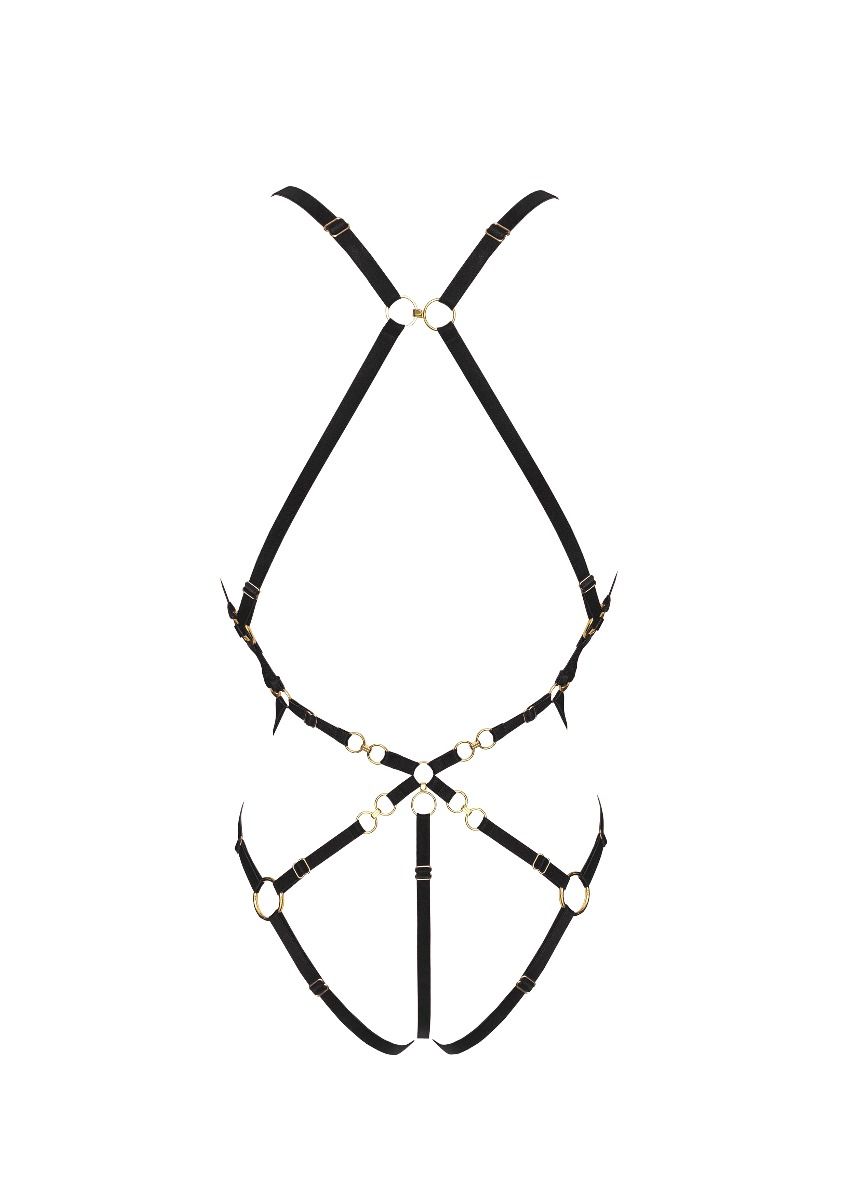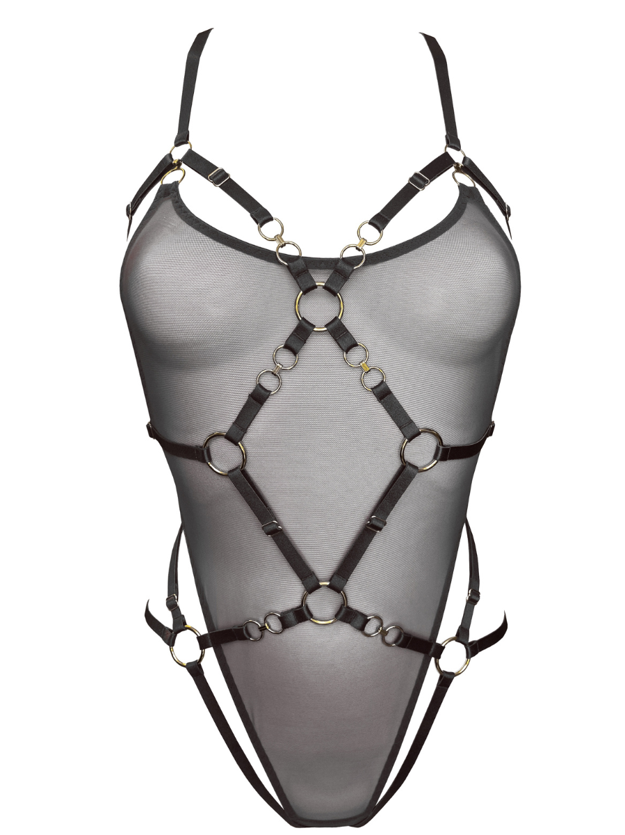 Captivate in the Kleio Multi-Style Harness Body. Displaying our new 24k gold plated chain-link component, this versatile piece features a detachable mesh body which is secured to rings on the harness via 24k gold plated ring hooks. Wear the elastic harness solo or with the accompanying mesh body panel.