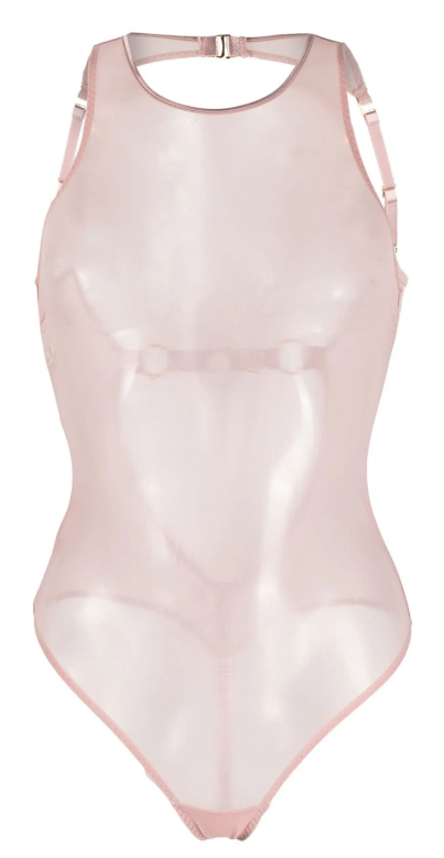 Kora sheer body from BORDELLE featuring light pink, sheer, crew neck, open back and sleeveless. Just a reminder that this piece must be tried on over your own garments.