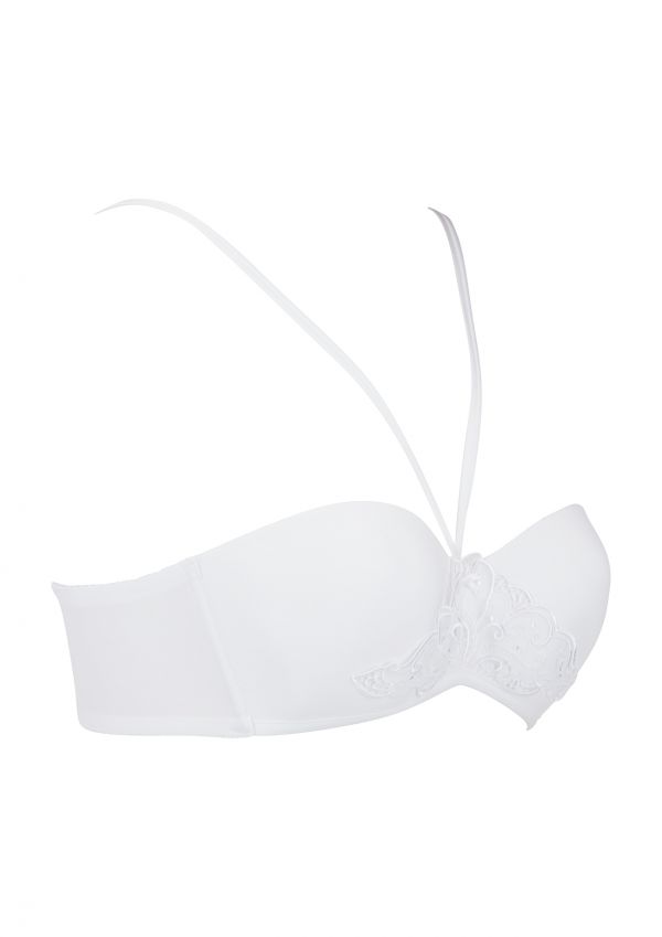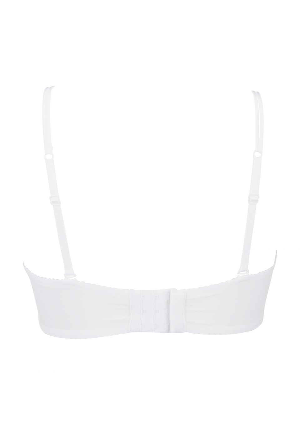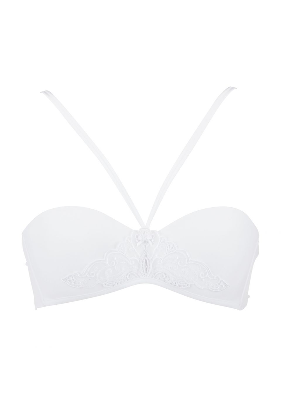 Adorned with delicate white lace, this bandeau La Dolce Vita bra from Parah features spaghetti shoulder straps that come from the centre creating a flattering V-shaped line - a unique touch to a classic lingerie piece.