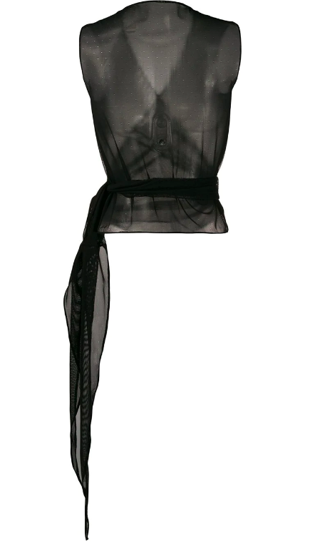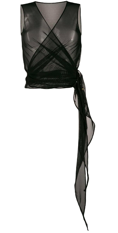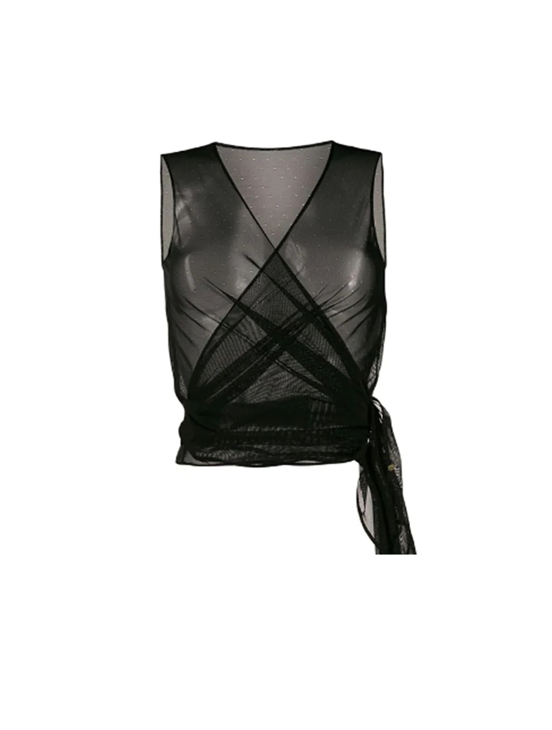 Black Lexi mesh wrap top from SOMETHING WICKED featuring a sleeveless design, a wrap style V neck and a sheer construction. Underwear and lingerie must be tried on over your own garments.