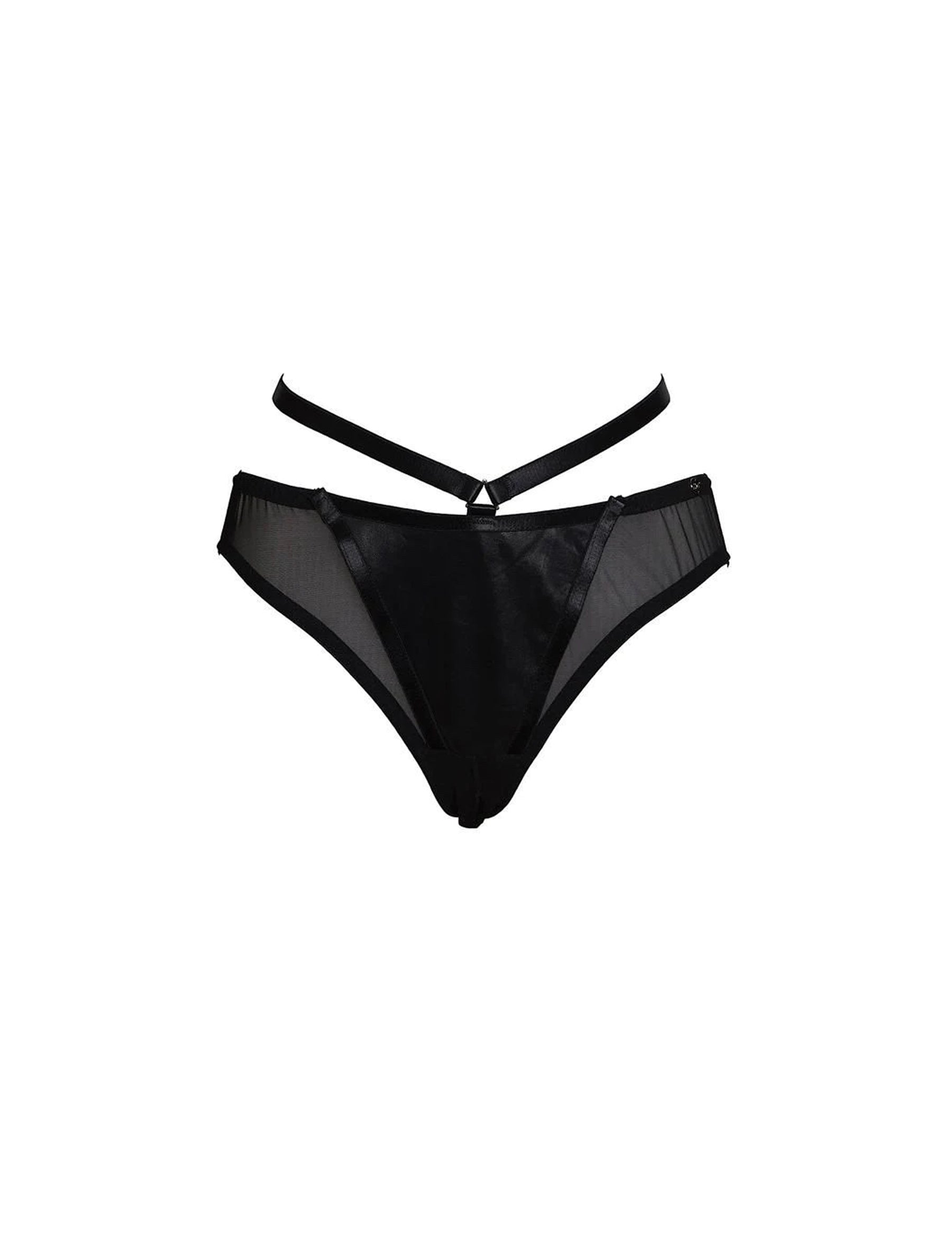 An exciting addition to our range of open back underwear, the Mia ouvert brief is designed for showing off. These cut out knickers feature a piece of luxe leather at the front, framed by contrasting sheer panels. Adjustable elastic straps create a flattering shape, and can be moved to be placed high or low on the waist. These enticing and revealing open bum panties feature an open crotch seam and allow you to embody your most wicked inner minx.