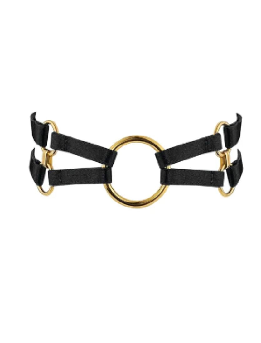 A satin elastic strap collar featuring 2 x 24k gold plated chain-link components and an oversized ‘O’ ring. Fully adjustable for a personalised fit, the accessory is secured with swan hooks at the nape of the neck.