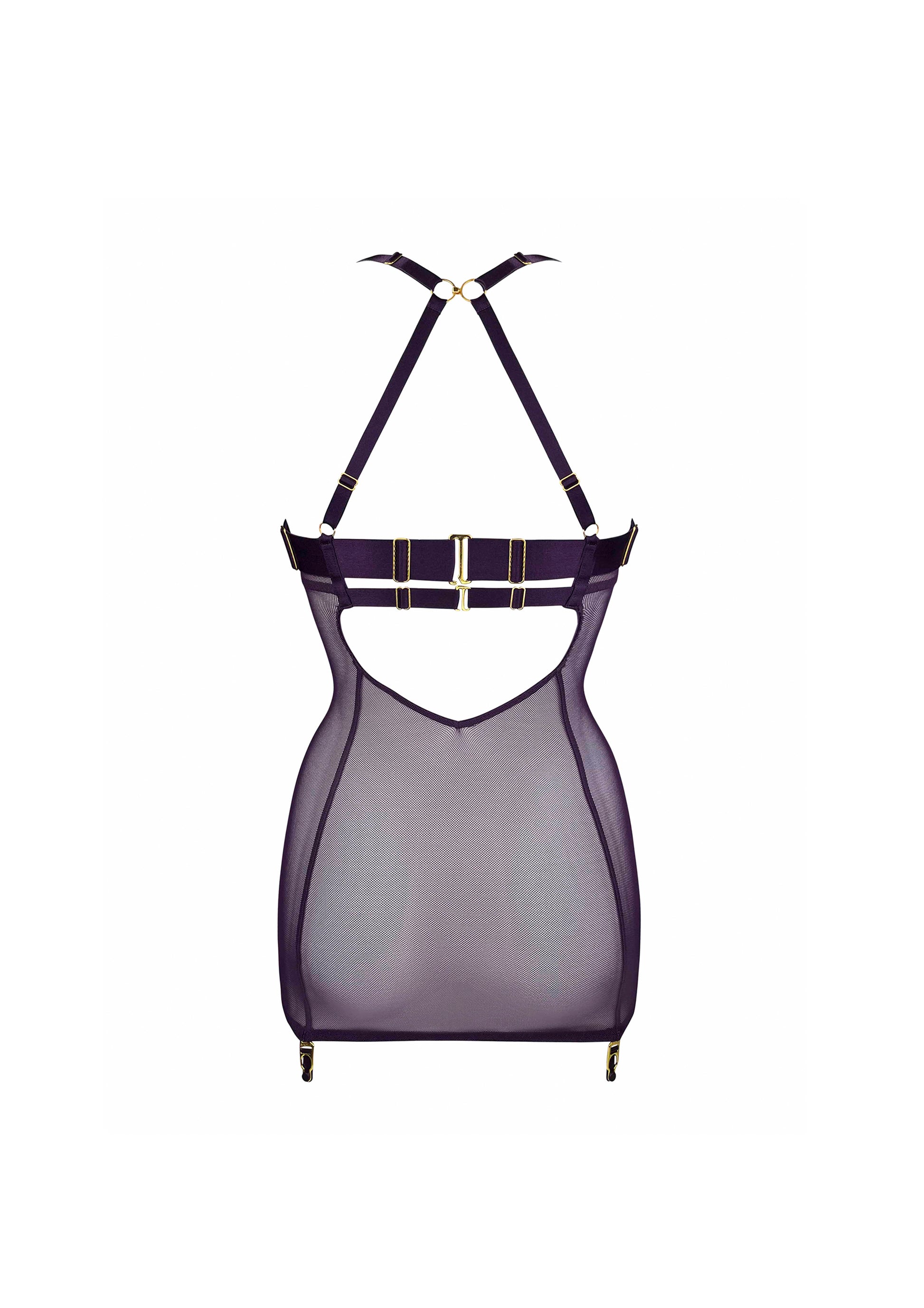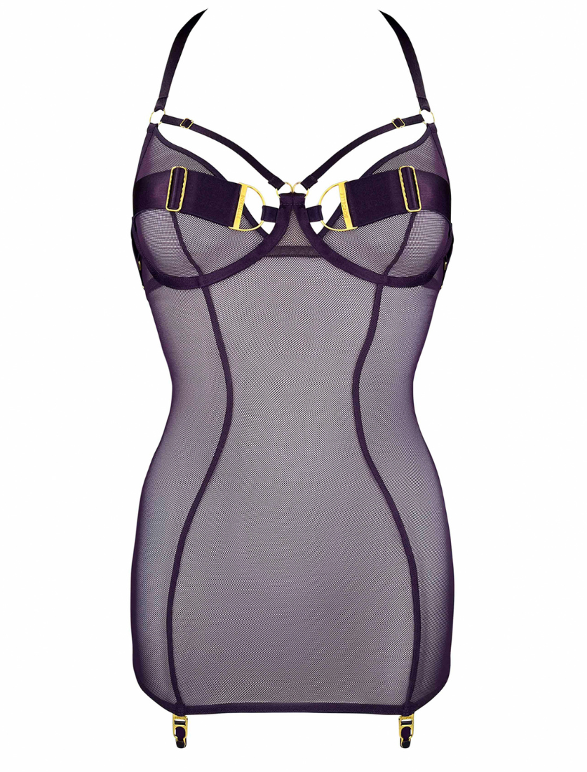 A modern take on lingerie as outerwear, this sheer mesh dress blends soft structure with refined detailing. Crafted from open-knit stretch mesh, it features underwired cups for gentle lift and support, overlaid with adjustable strapping for coverage. Satin-covered seams trace the body’s contours to create a sculpted silhouette, while removable suspender clips offer styling versatility.