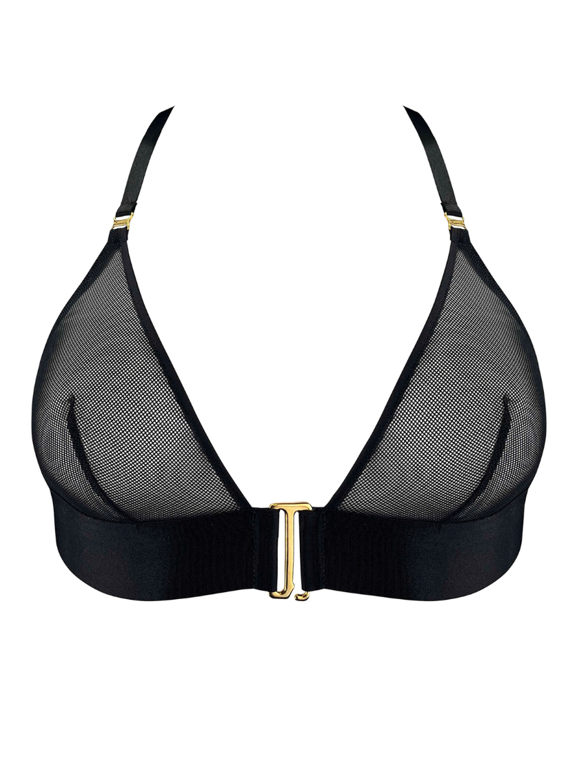 A soft bra designed for comfort without compromising on style, it combines sheer open-knit stretch mesh with soft wide band elastic to offer a clean, sculptural look. At the back, the open design is secured with a 24k gold plated swan hook and ring hook fastening. Lightweight and non-wired, it’s ideal for everyday wear, or to be styled up with Nipplets for a bolder statement.