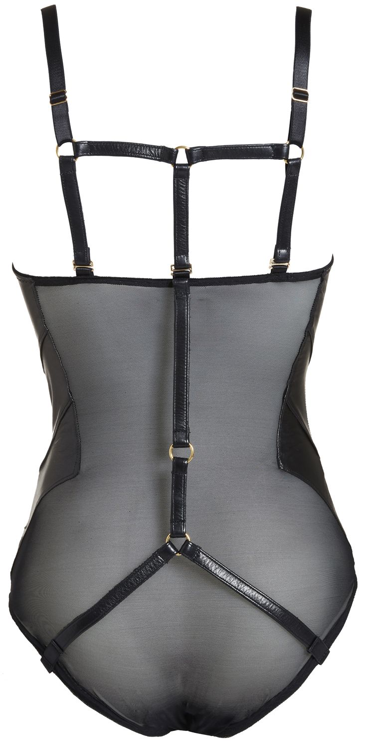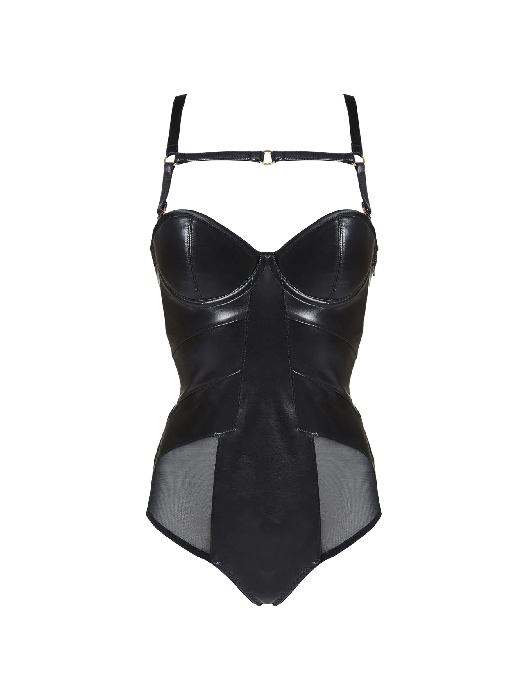 Embrace your playful and seductive side in this statement bodysuit from the Nina collection. Leather panels adorn the sides of the body, designed to compliment each curve. Decadent yet modern, the leather strapping and gold rings decorate the back and the neckline. Gold plated rings are strategically placed at the lower back; why not try attaching a Nina leather tassel or some centre hook handcuffs from our accessories range?