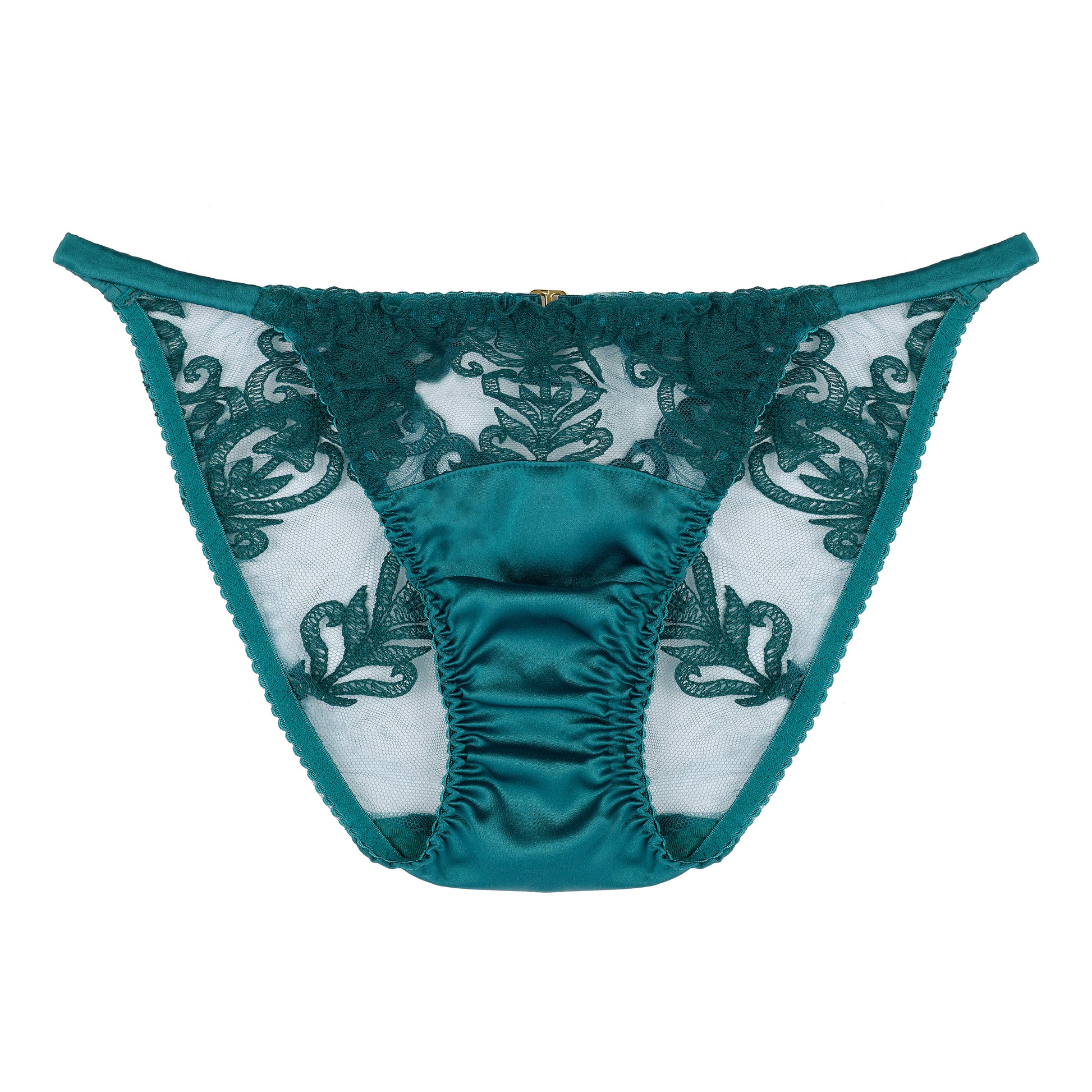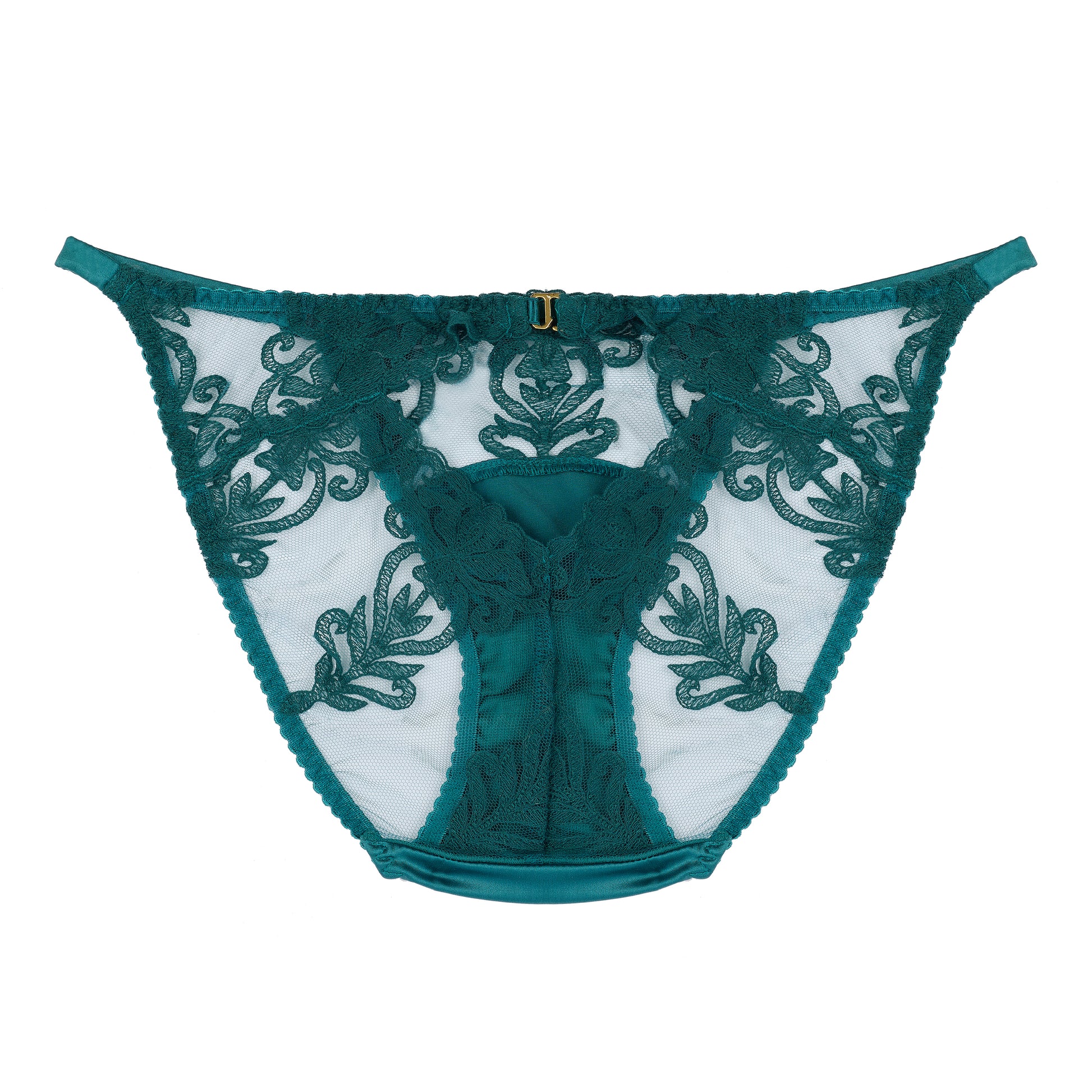 Make a statement with the Olivia Ouvert brief in opulent peacock green. This open back brief is crafted from sheer Italian tulle and bold embroidery, balanced with luxurious silk. The open back features an elegant, scalloped shape from the embroidery and is fastened with a gold-plated hook. The silk-encased elastic side straps add an extra touch of luxury to this alluring style.