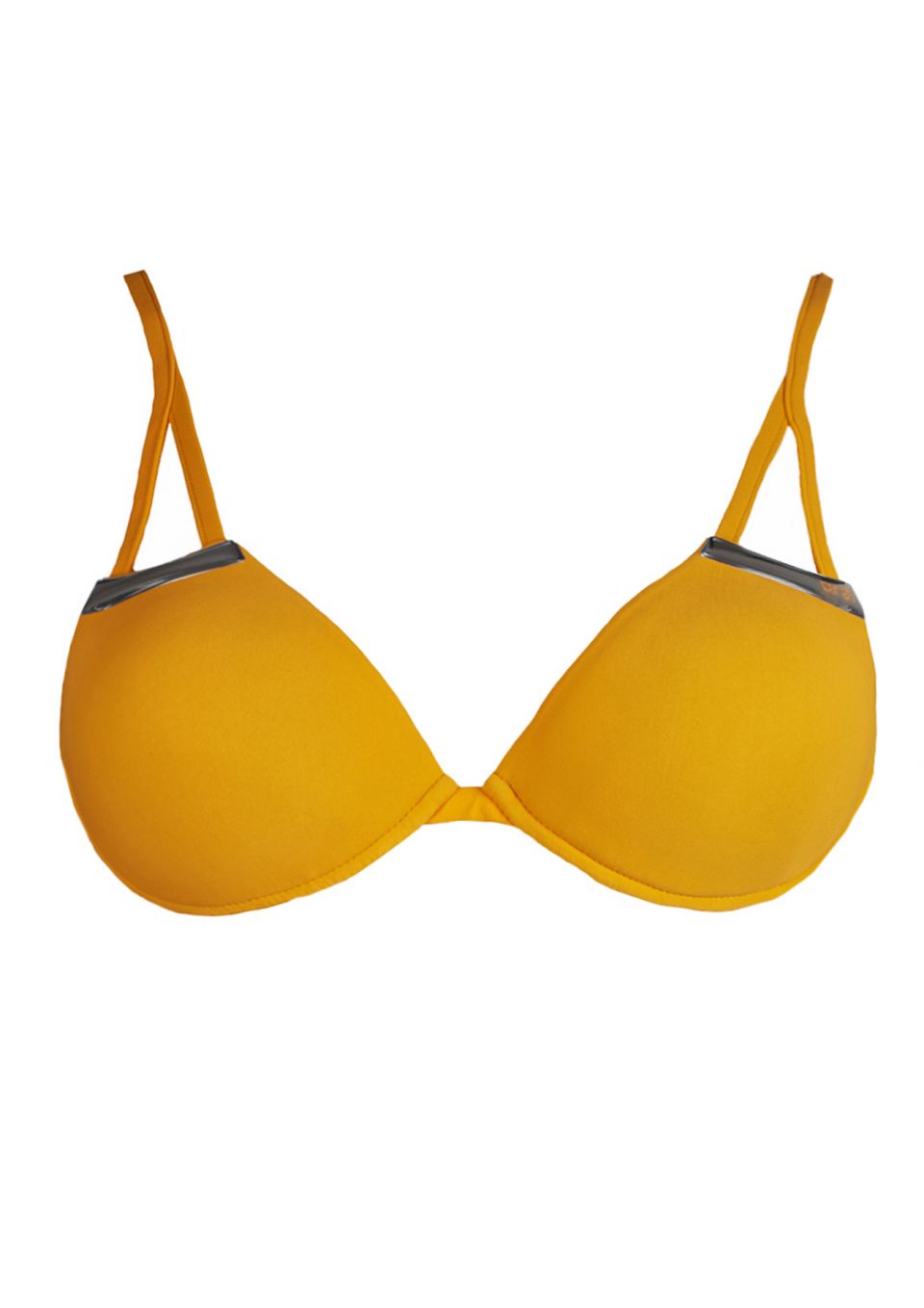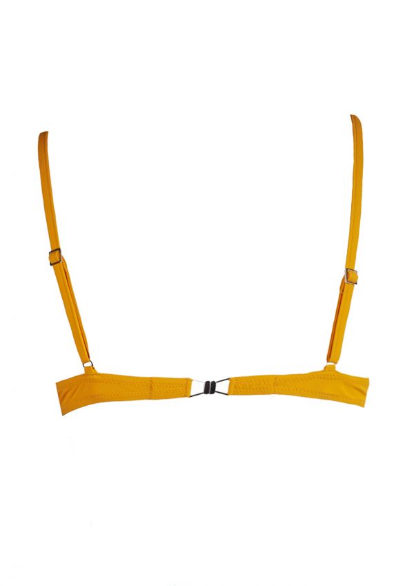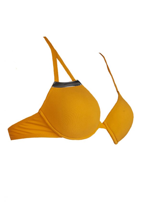 Stylish and chic cut out halter bikini top in a vibrant papaya orange. The halter plunge neckline gives a flattering shape. The B cups have extra padding.