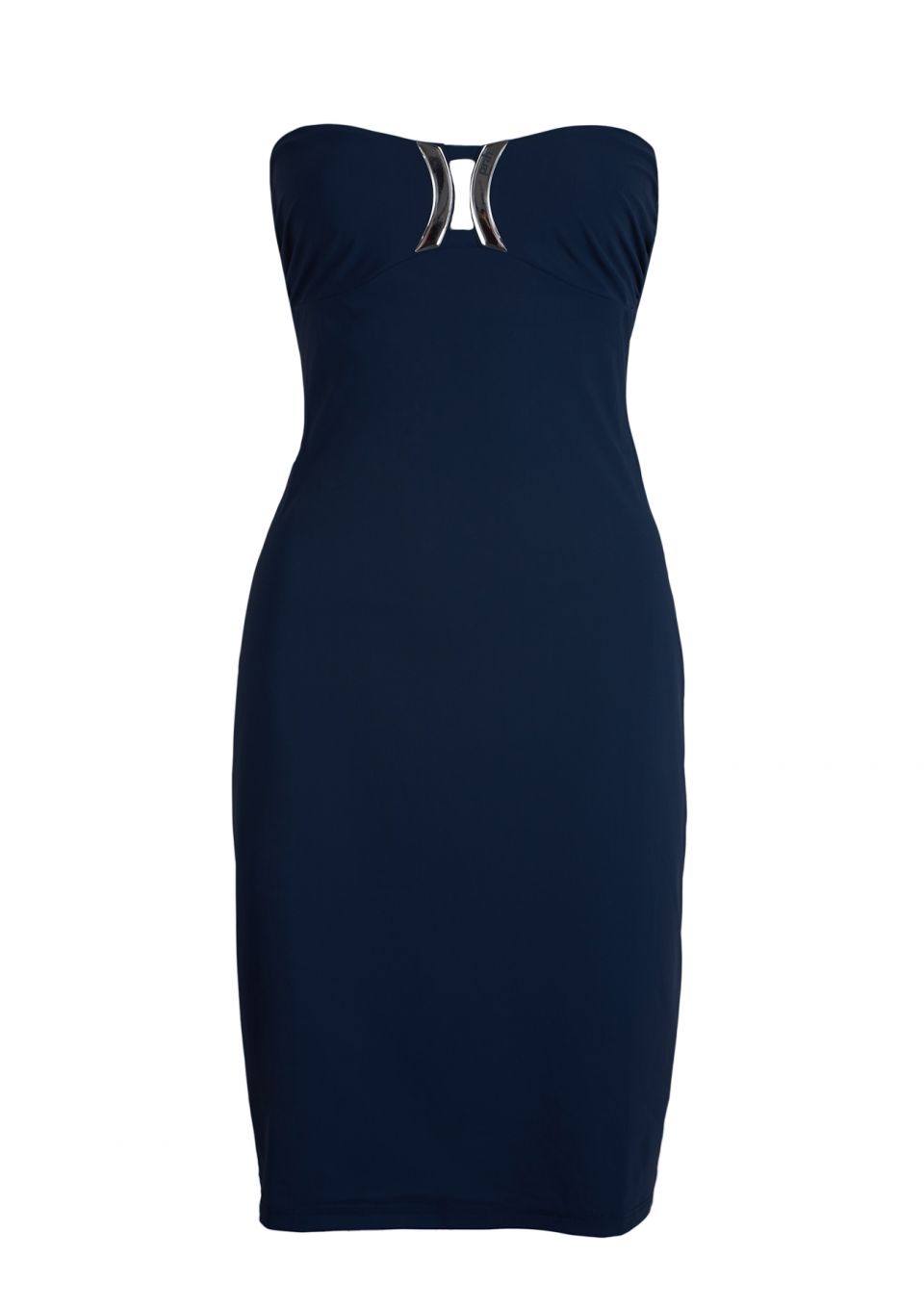 A chic and simple knee length dress with a sleek, figure-hugging cut, and a daring cut out at the centre front.