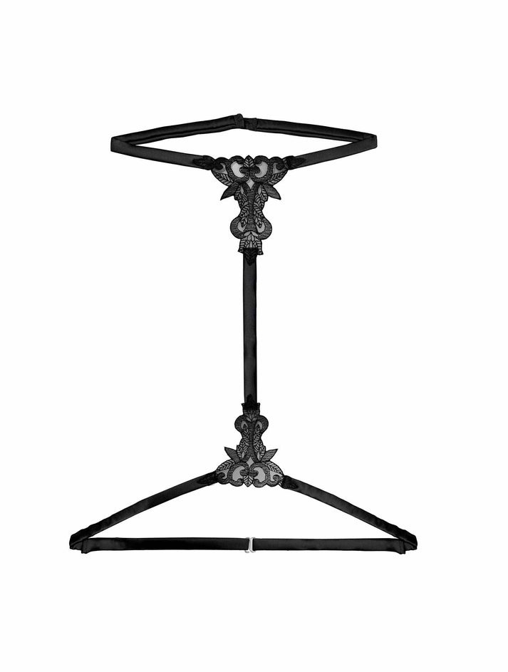 The Onyx harness features a high-neck design with slender black silk encased elastic straps that frame your neck and midriff. Two bespoke black embroidery motifs adorn the harness creating a dramatic, modern look.