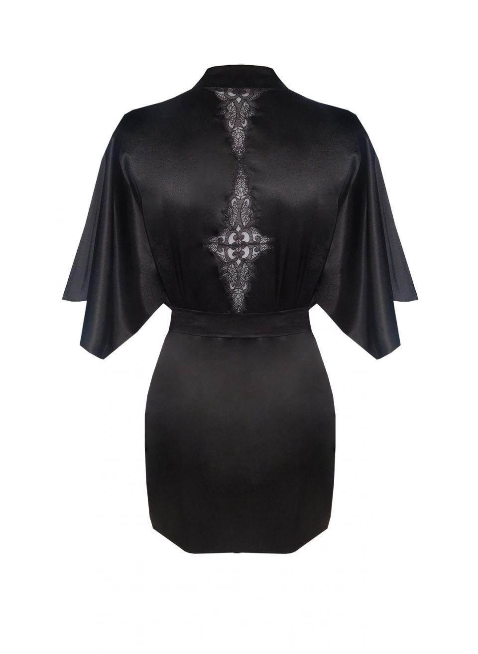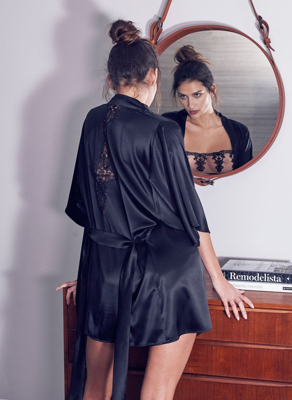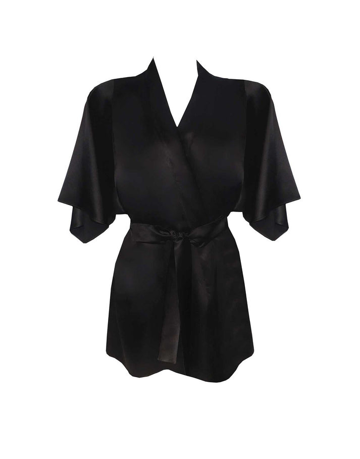 The Onyx silk robe is a luxurious nightwear piece crafted in dramatic black silk with an embroidered motif adorning the centre-back. Three-quarter length sleeves drape and flutter at your sides to give a glamorous kimono look.