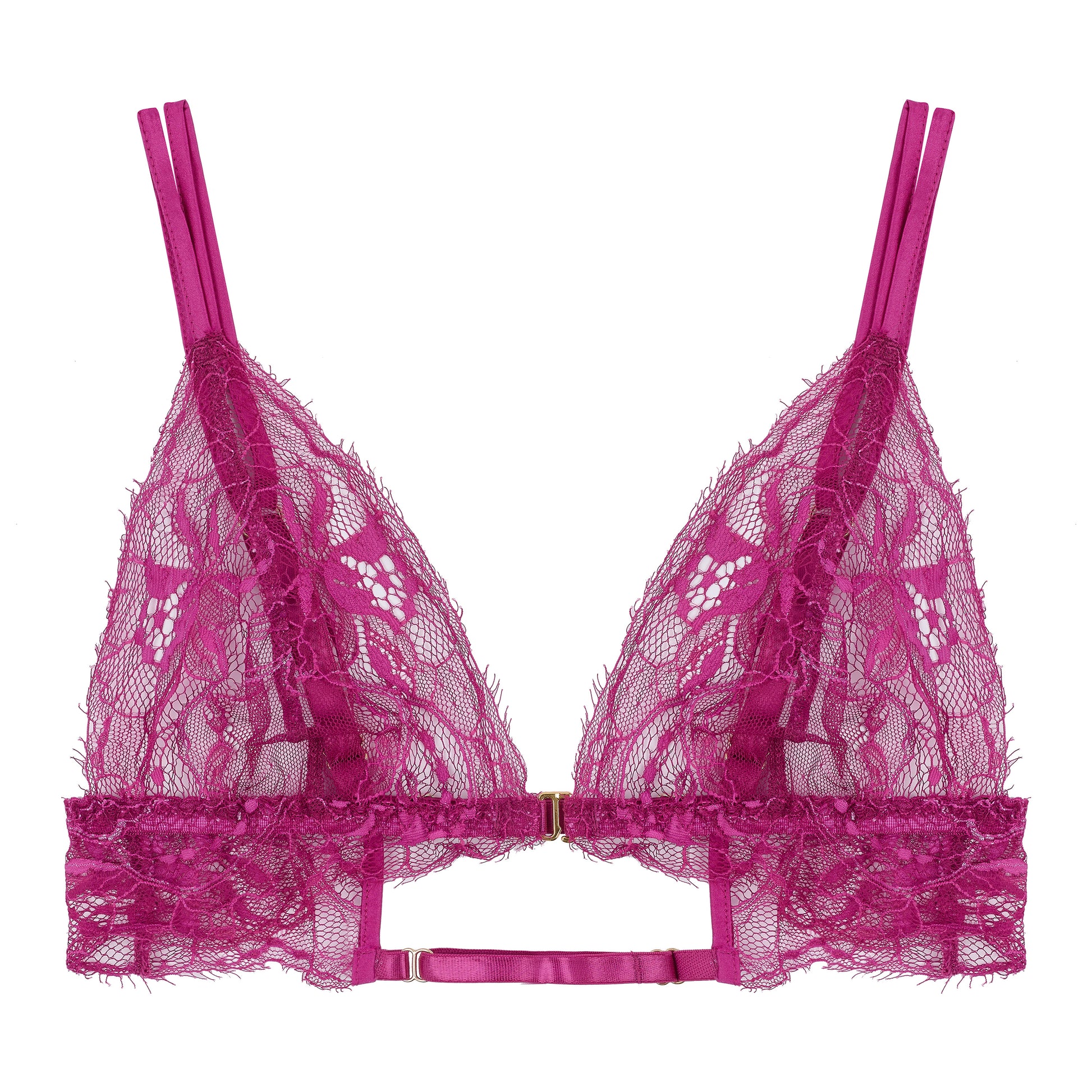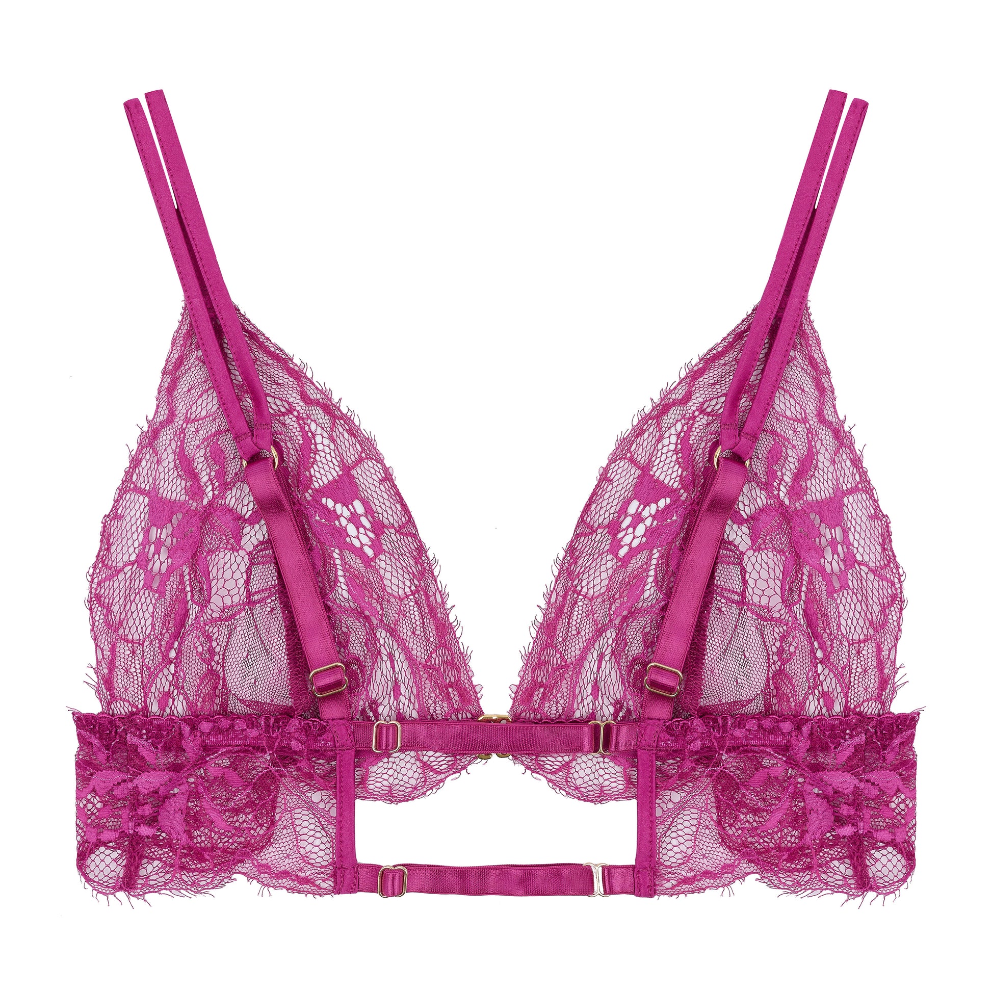 A non-wired soft cup bra delicately crafted from Fuchsia pink French lace with soft silk shoulder straps, and adjustable back straps. Featuring an elegant 24K gold plated front fastening swan hook, and light elasticated under bust, this style is a favourite for its comfort and effortless style.