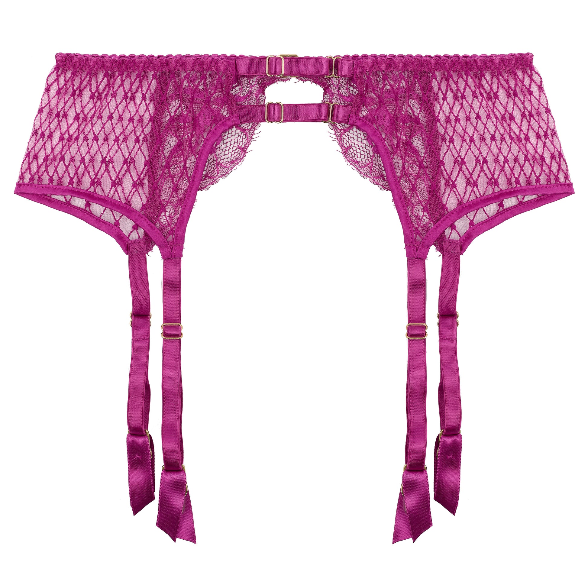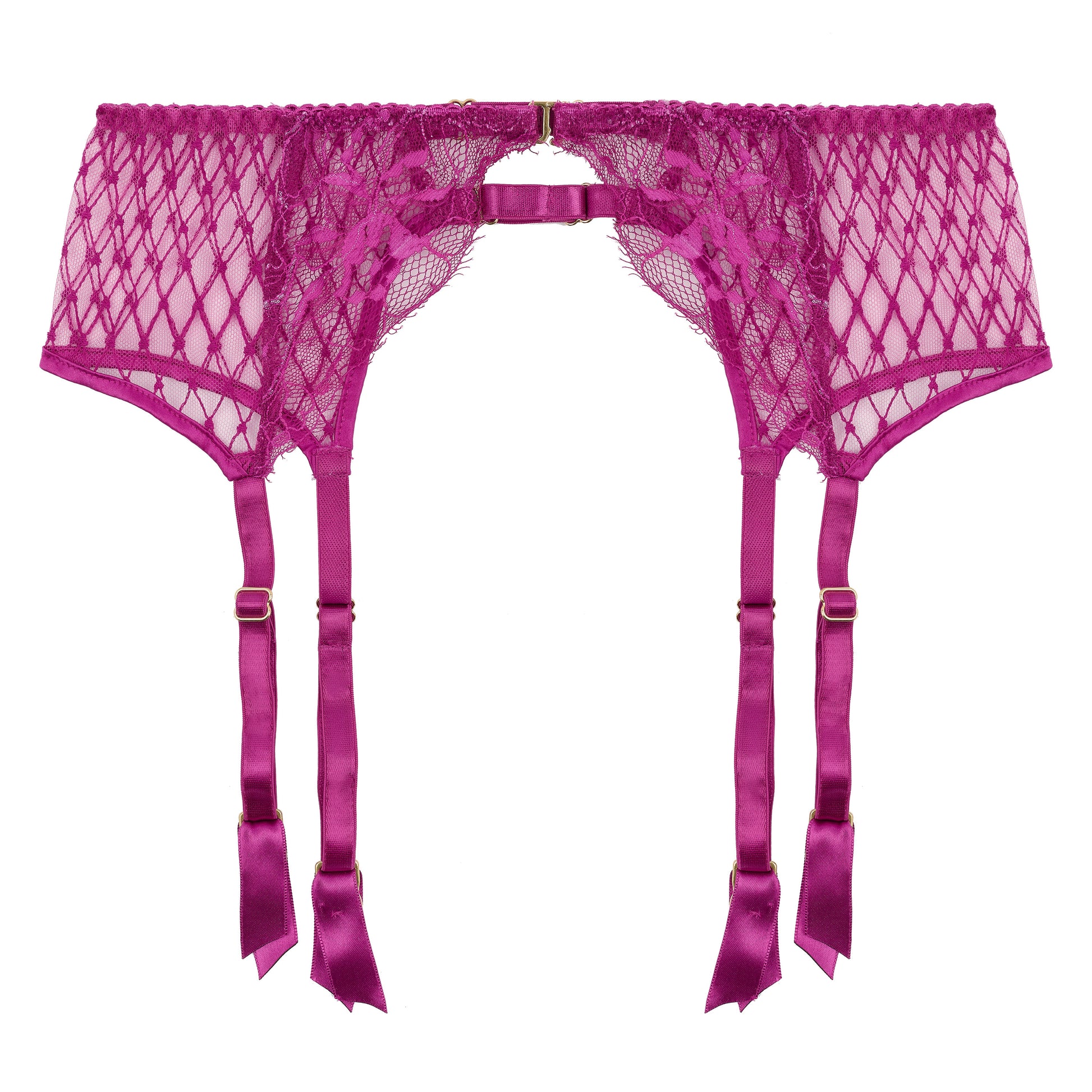 Crafted from our signature French lace in Fuchsia Pink, and balanced beautifully with bespoke embroidery with hidden hearts, this front fastening suspender belt also features an elastic back encased in silk for your ultimate comfort and smoothing silhouette.