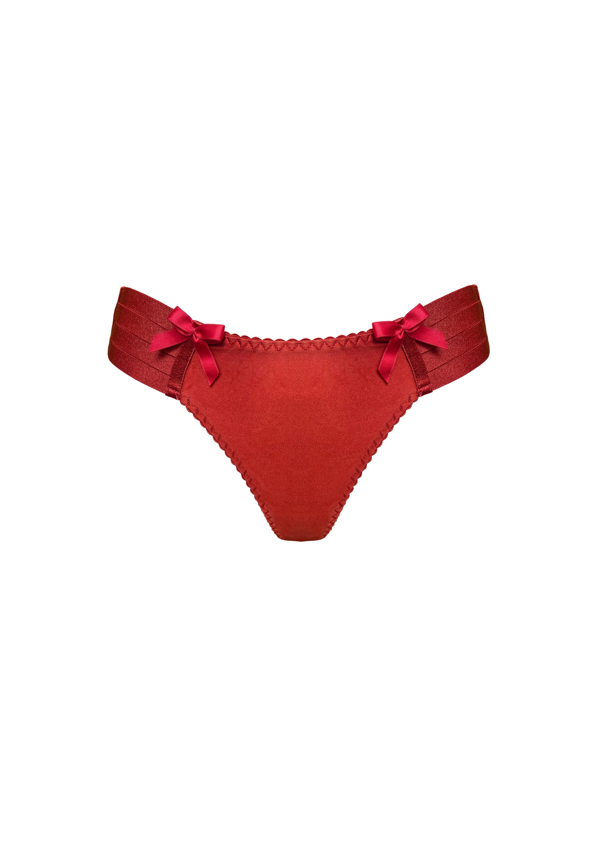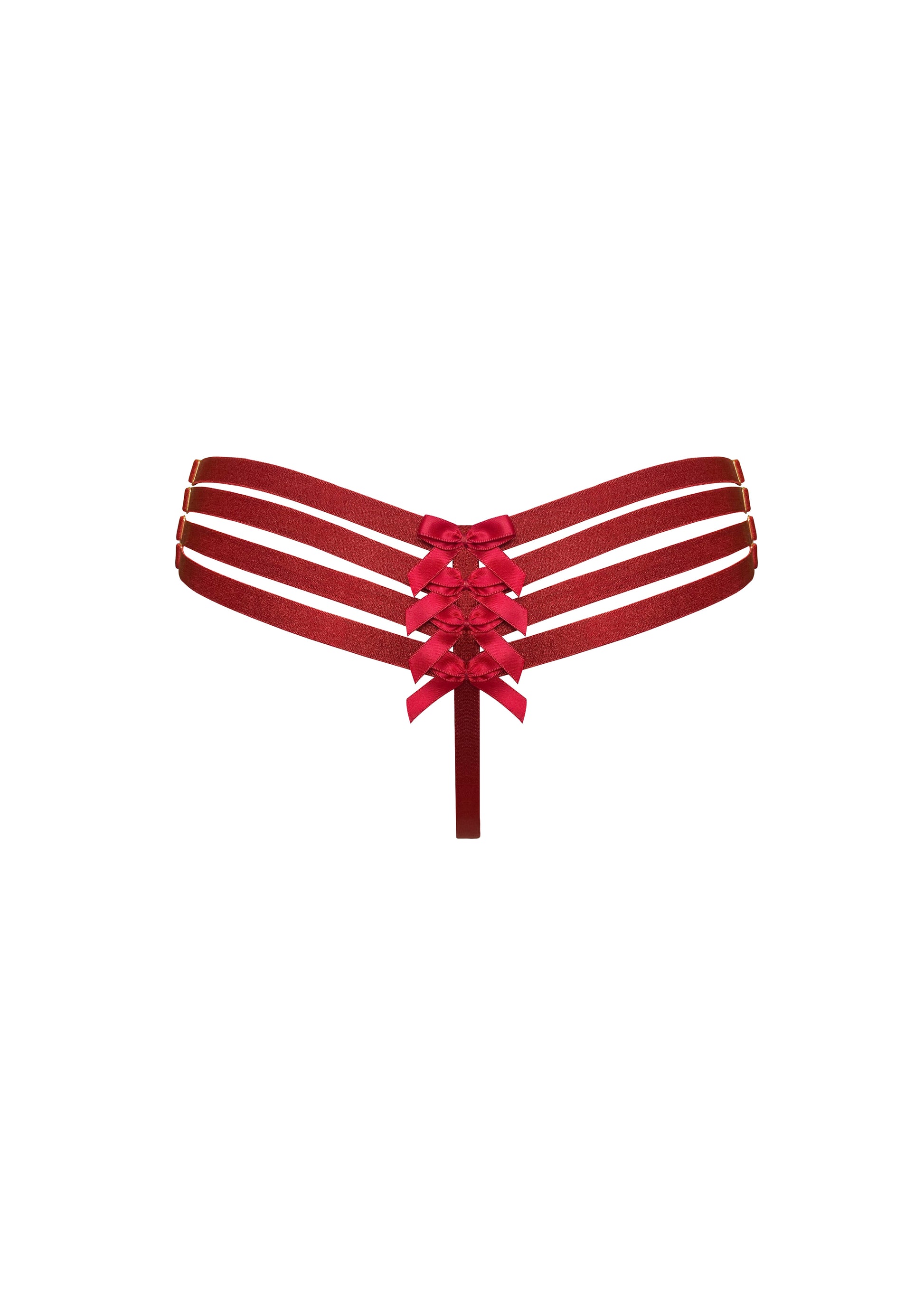 A classic, statement thong by Bordelle made up of red silk satin and fully adjustable satin elastic strapping, generously decorated with satin bows and 24k gold plated hardware.
