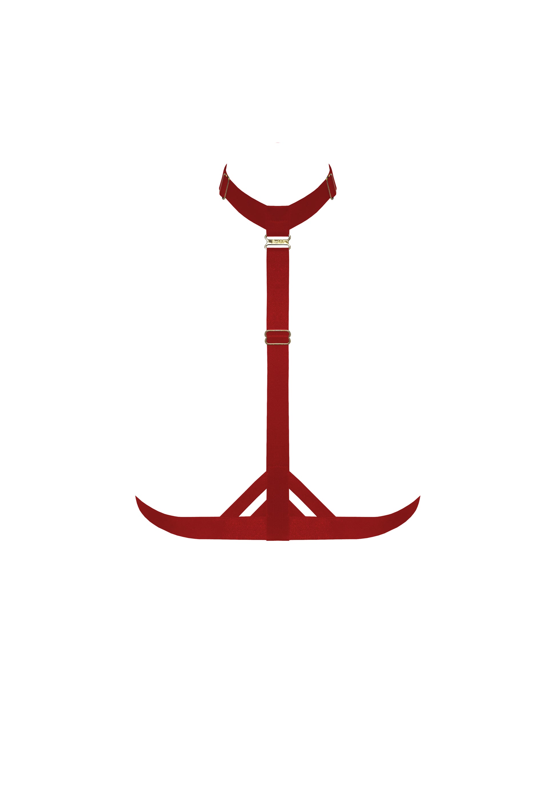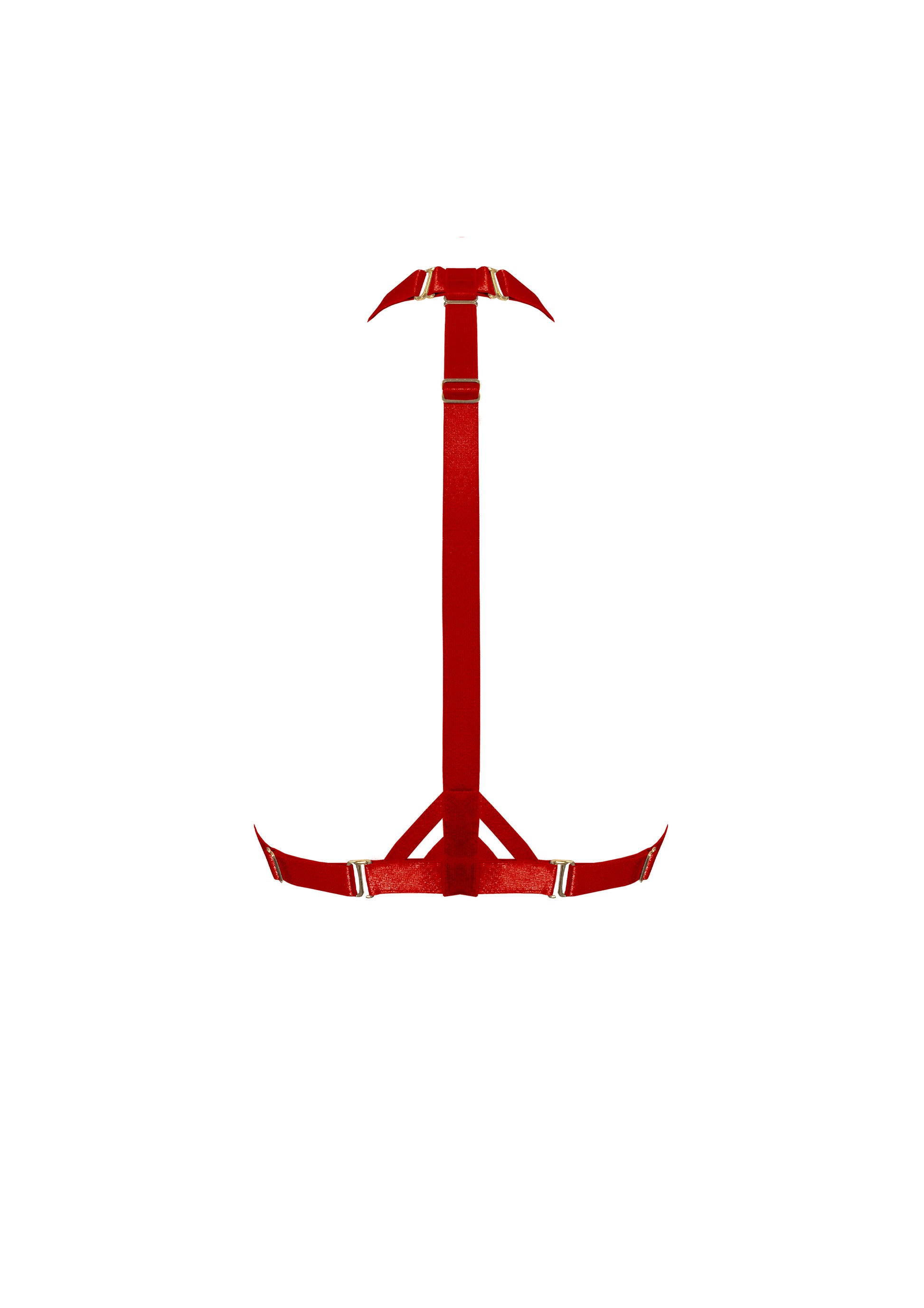 A simple yet elegant harness in luxurious red satin elastic strapping. Fully adjustable for a personalised fit, this versatile piece can be worn alone, layered over a bra or styled with outerwear.