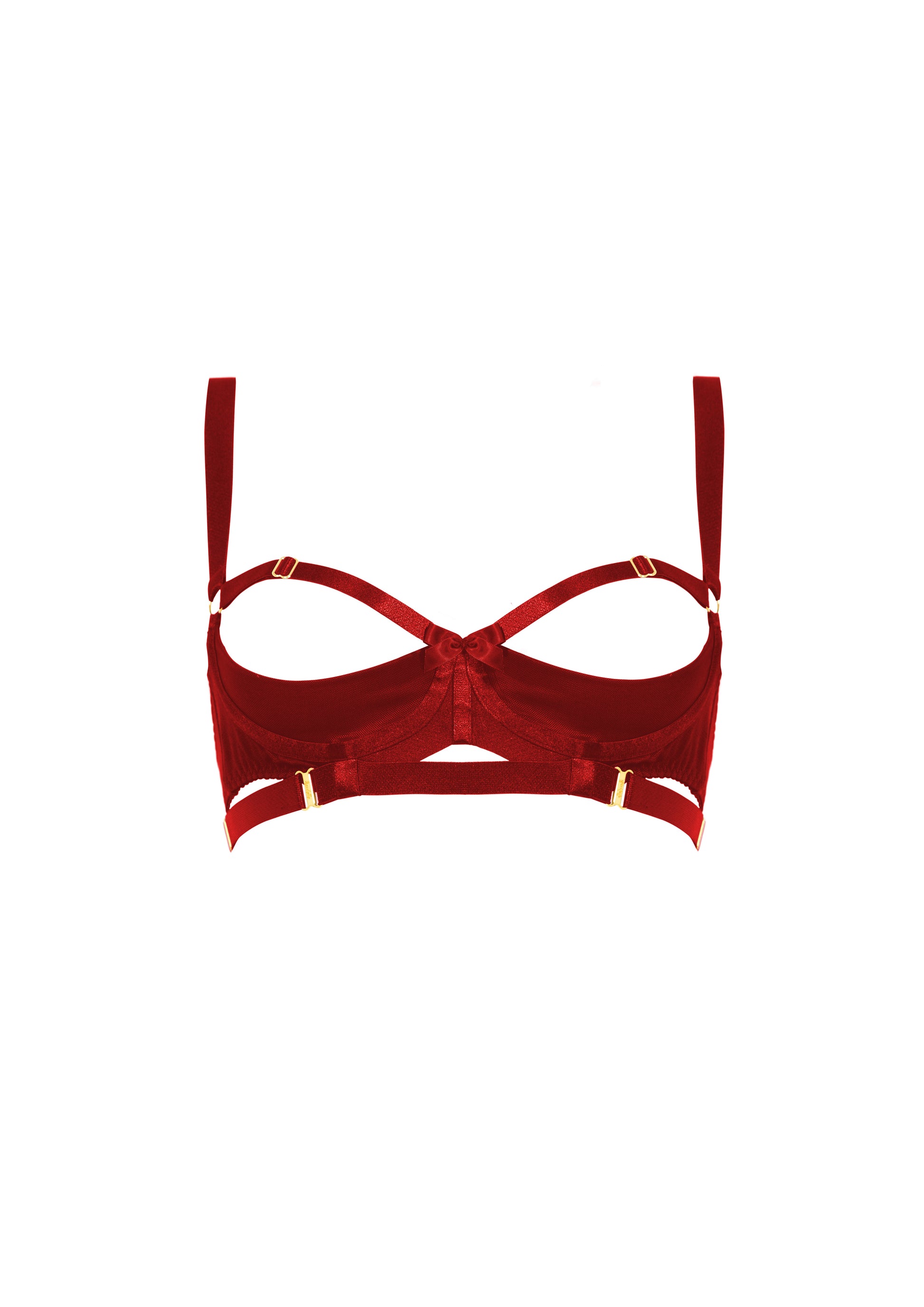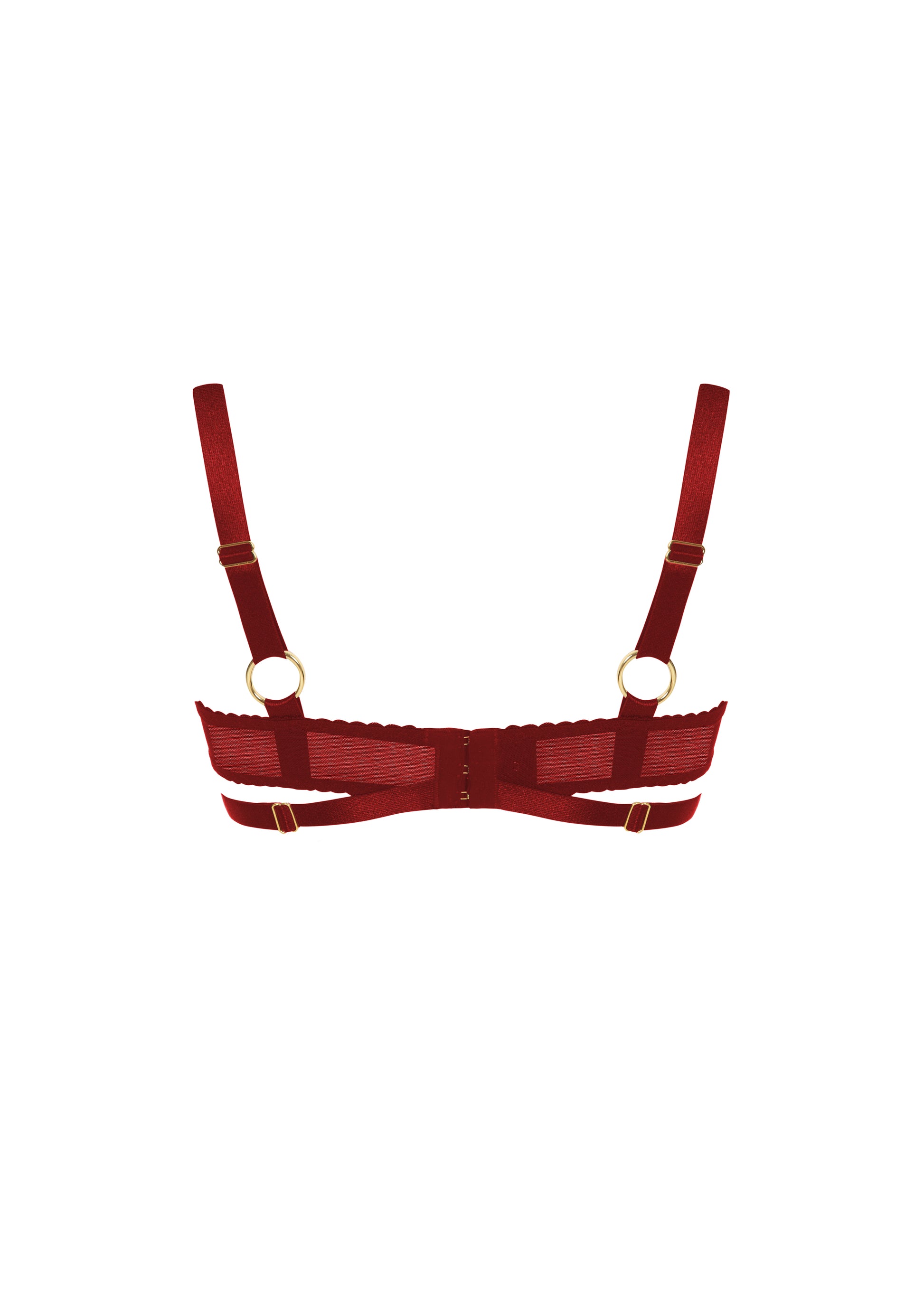 A captivatingly sexy shelf bra with Bordelle's signature red satin strap detailing making seductive contour around the bust. This is a striking piece that shows just who is in control. An underwired ouvert shelf bra featuring soft mesh quarter cups for gentle support. The detailed elastic panelling centre front, adjustable bust straps and oversized ‘O’ rings create a bondage aesthetic.