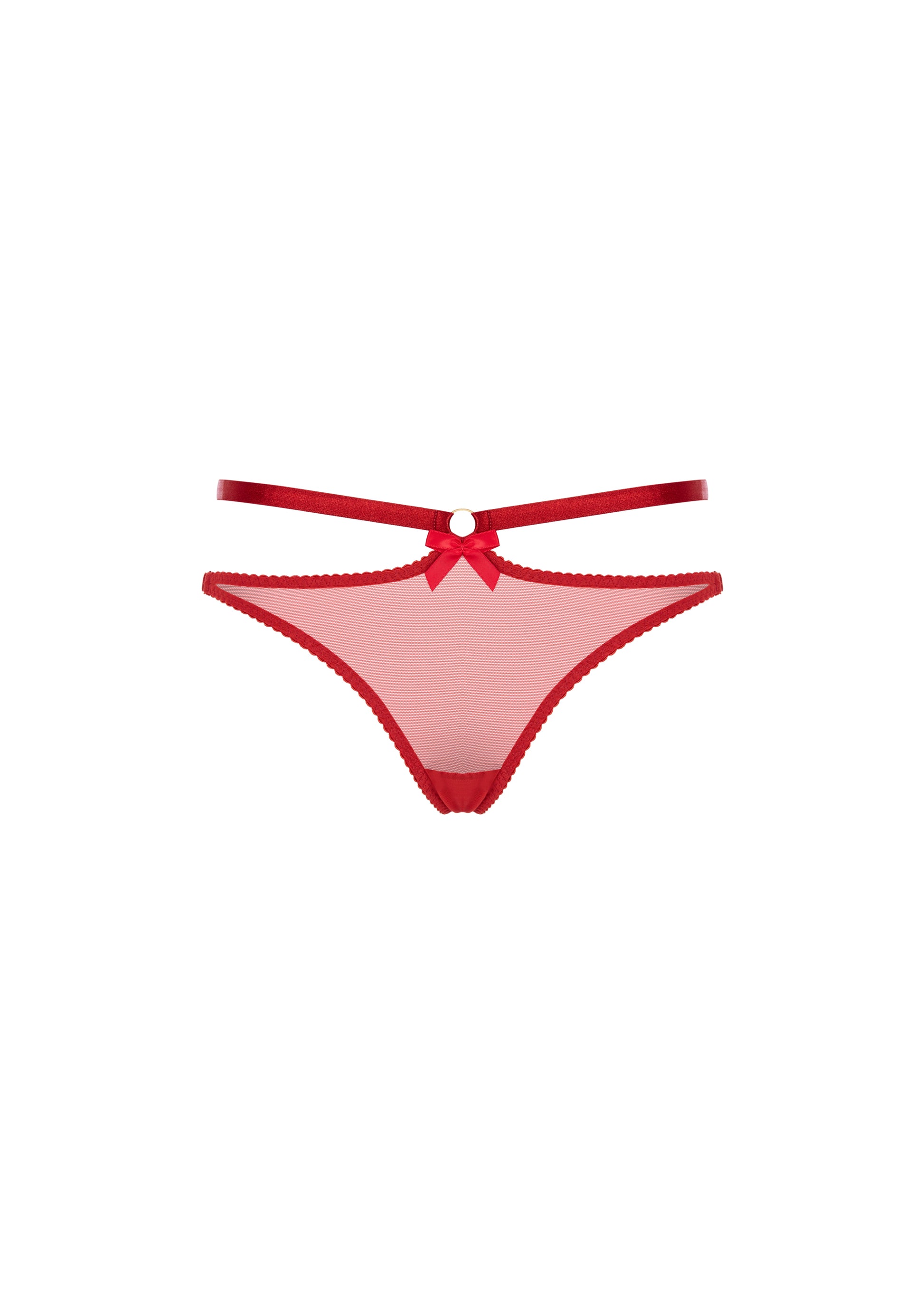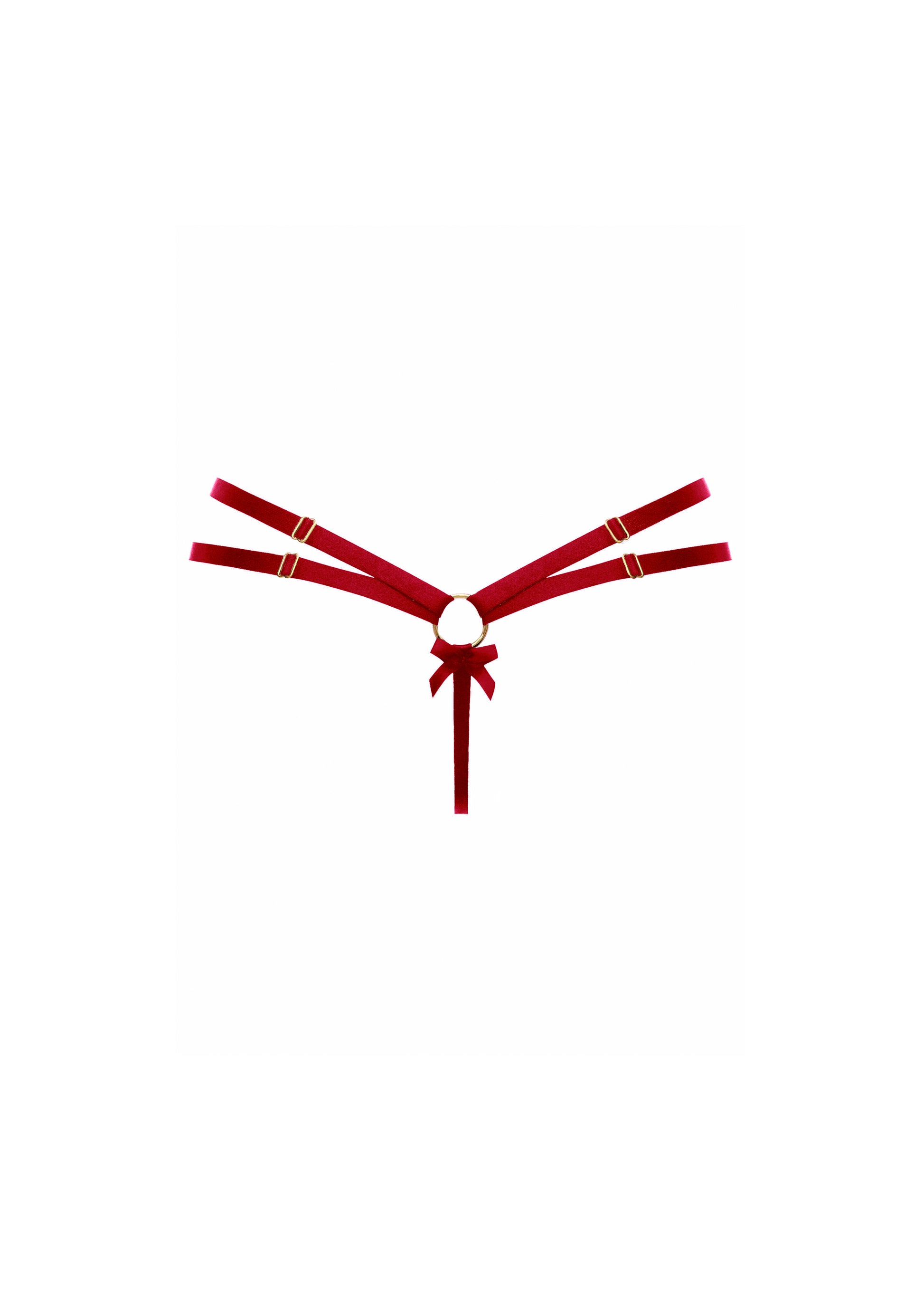 A high leg sheer mesh luxury thong with satin elastic harness detail. Fully adjustable at the waist and hip, finishing with an oversized 24k gold plated ‘O’ ring at the centre back.