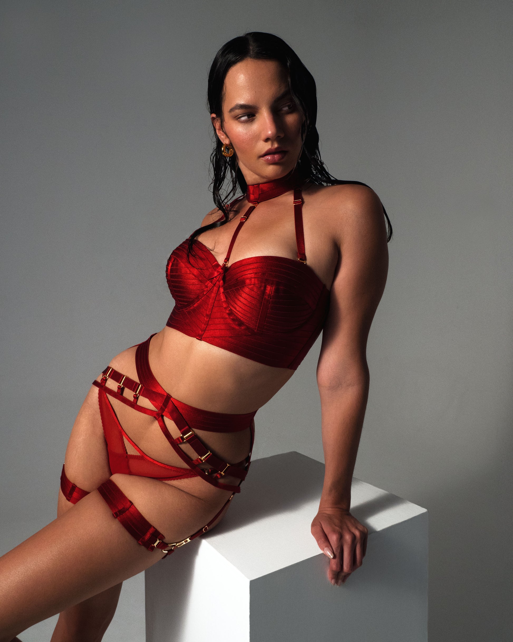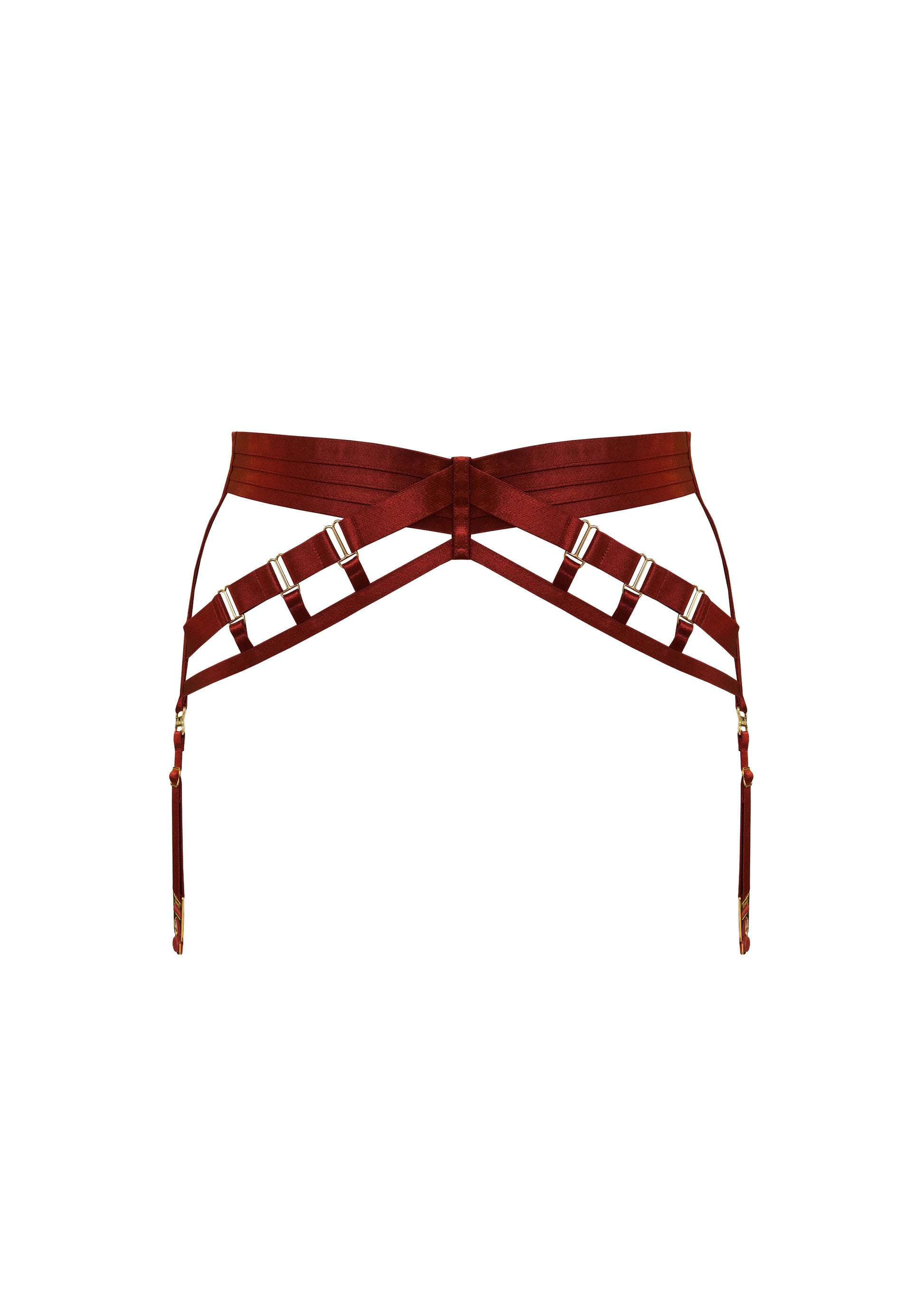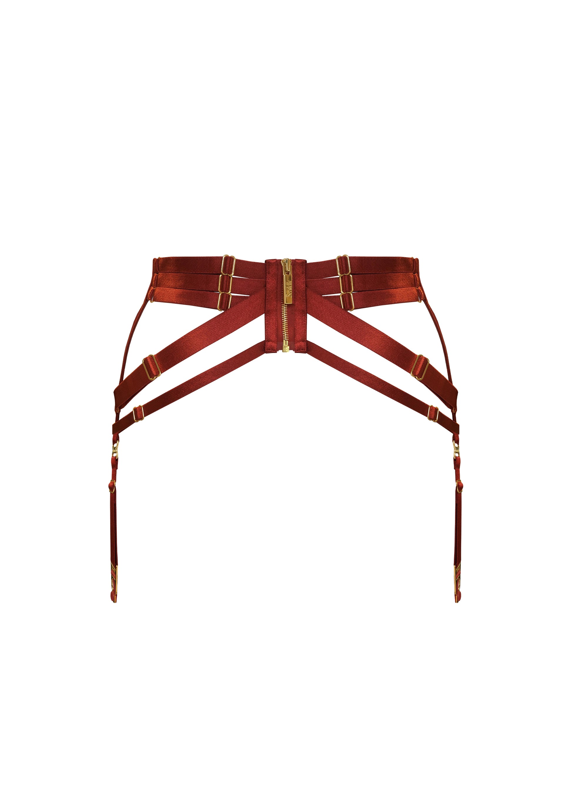 Red panel suspender from BORDELLE featuring stretch design, adjustable fit, satin finish and 24k gold plated zip fastening.