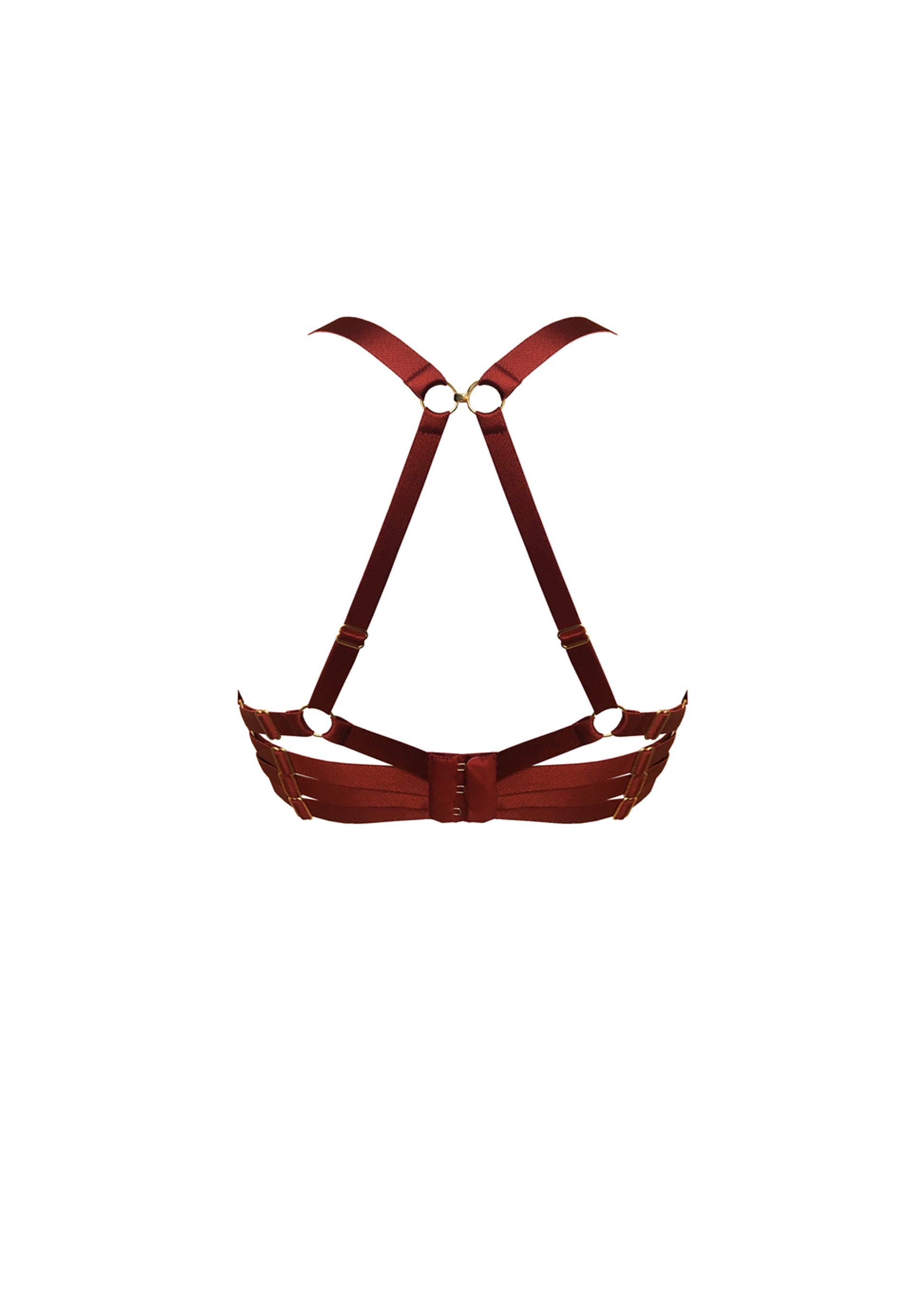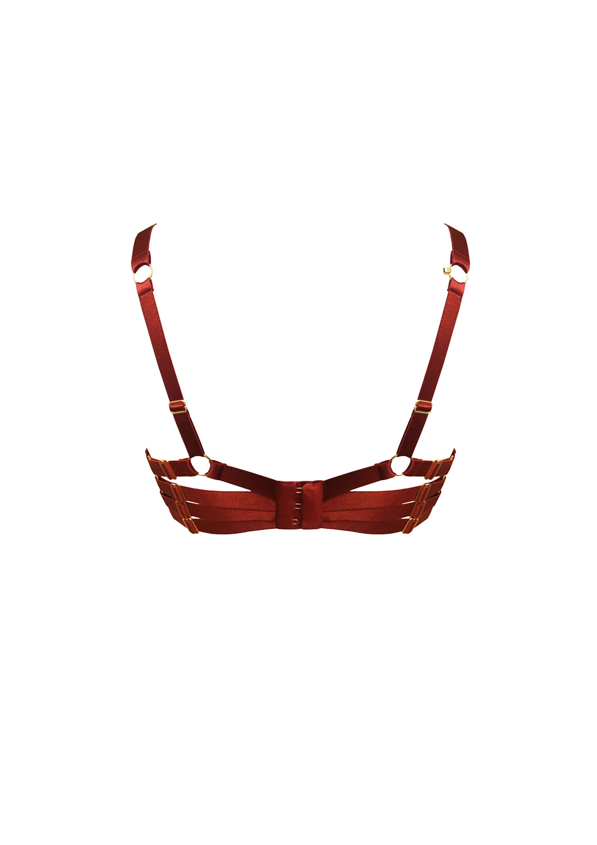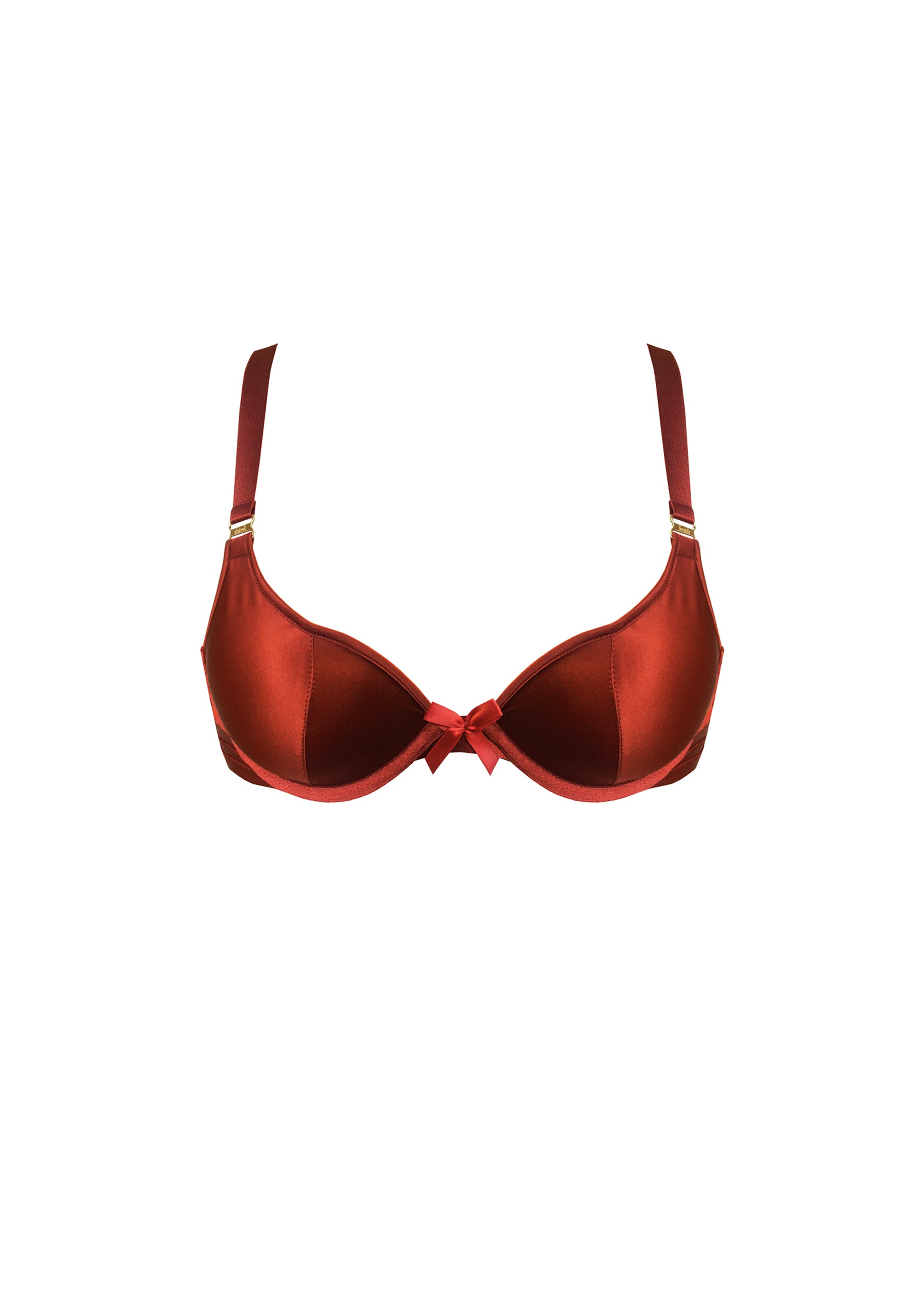 A red satin push-up bra silhouette featuring moulded cups covered in smooth silk and fully adjustable back straps. Secured with a hook & eye fastening at the center-back, with an additional hook near the top of the straps for optional extra 'push'.