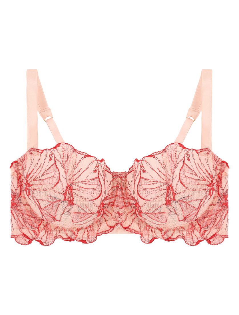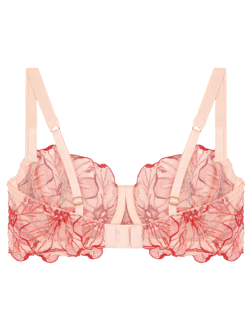 Indulge in the beauty of the limited edition Rosa collection with the bestselling Balcony Bra. This luxury bra is designed to accentuate the bust whilst offering good coverage. The elegant petal edge of the bespoke embroidery design beautifully frames the bust and continues around the body of the bra. Silk straps are combined with 24 carat gold plated hardware for a subtle sparkle against the romantic pink hues. Available in sizes 30D-36DD, the cups are lined with soft tulle, for ultimate comfort and support.
