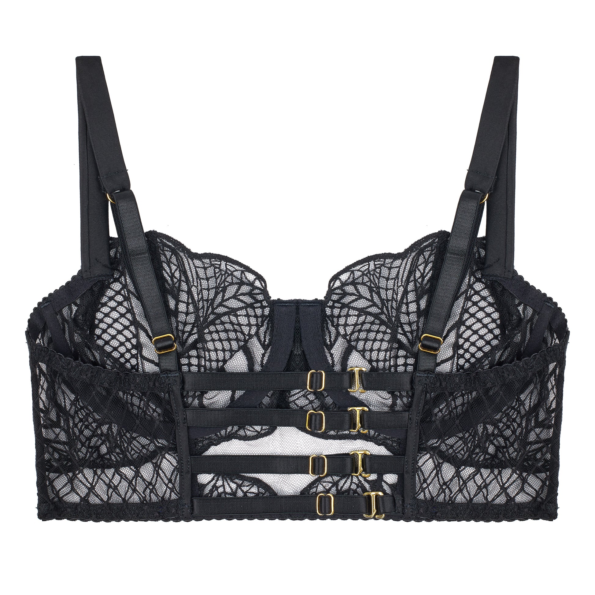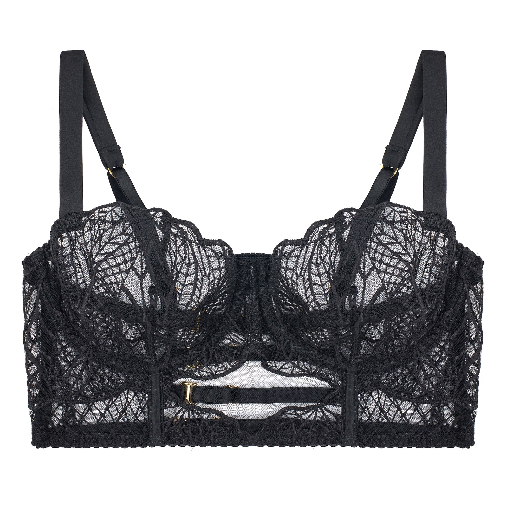 Crafted using the finest fabrics and finished with 24-carat gold plated hardware, this black embroidered lingerie set features our adjustable Longline underwired bra, sized in S, M, L, and our first Brazilian style brief, paired together for a show stopping, alluring look that perfectly blends expert craftsmanship with modern femininity.