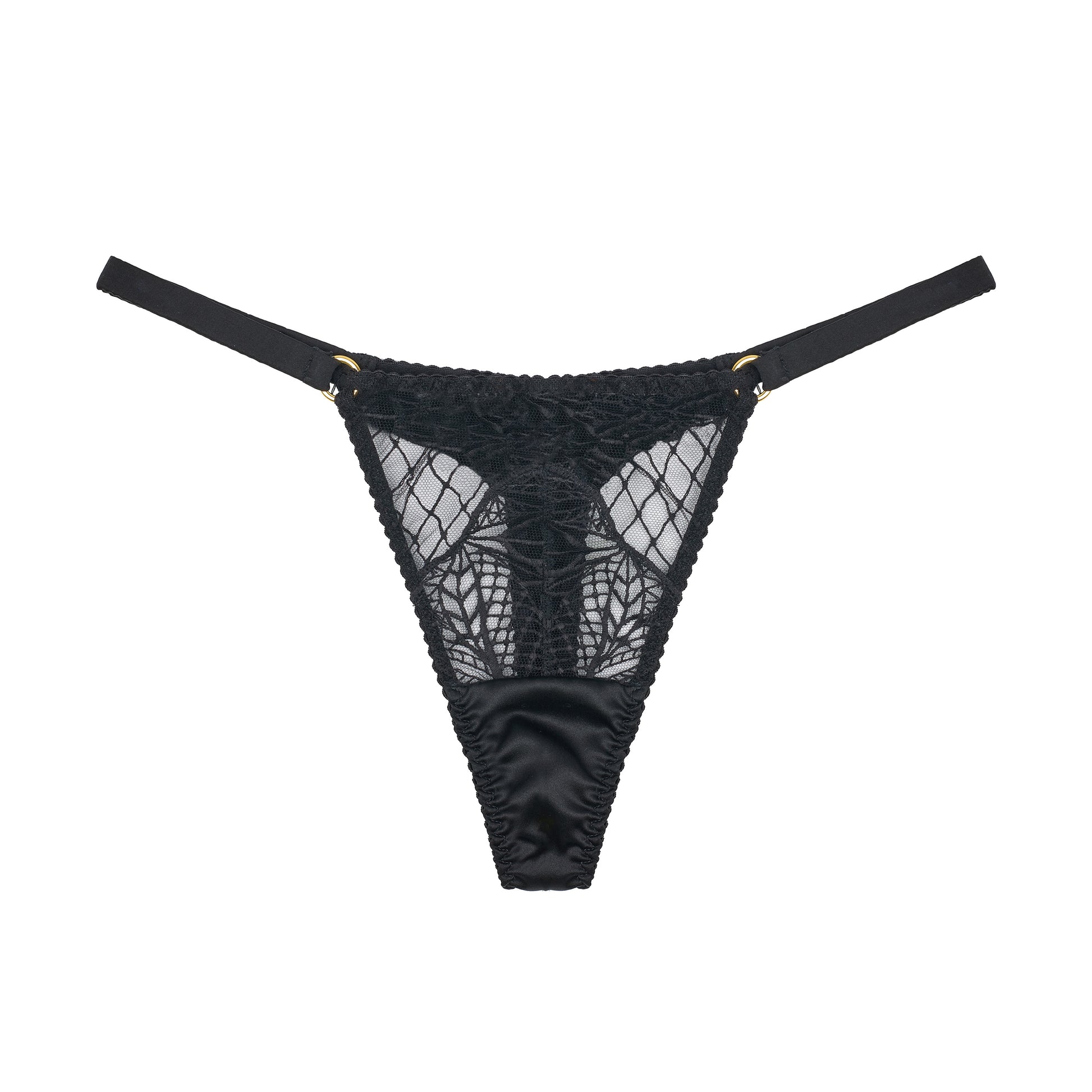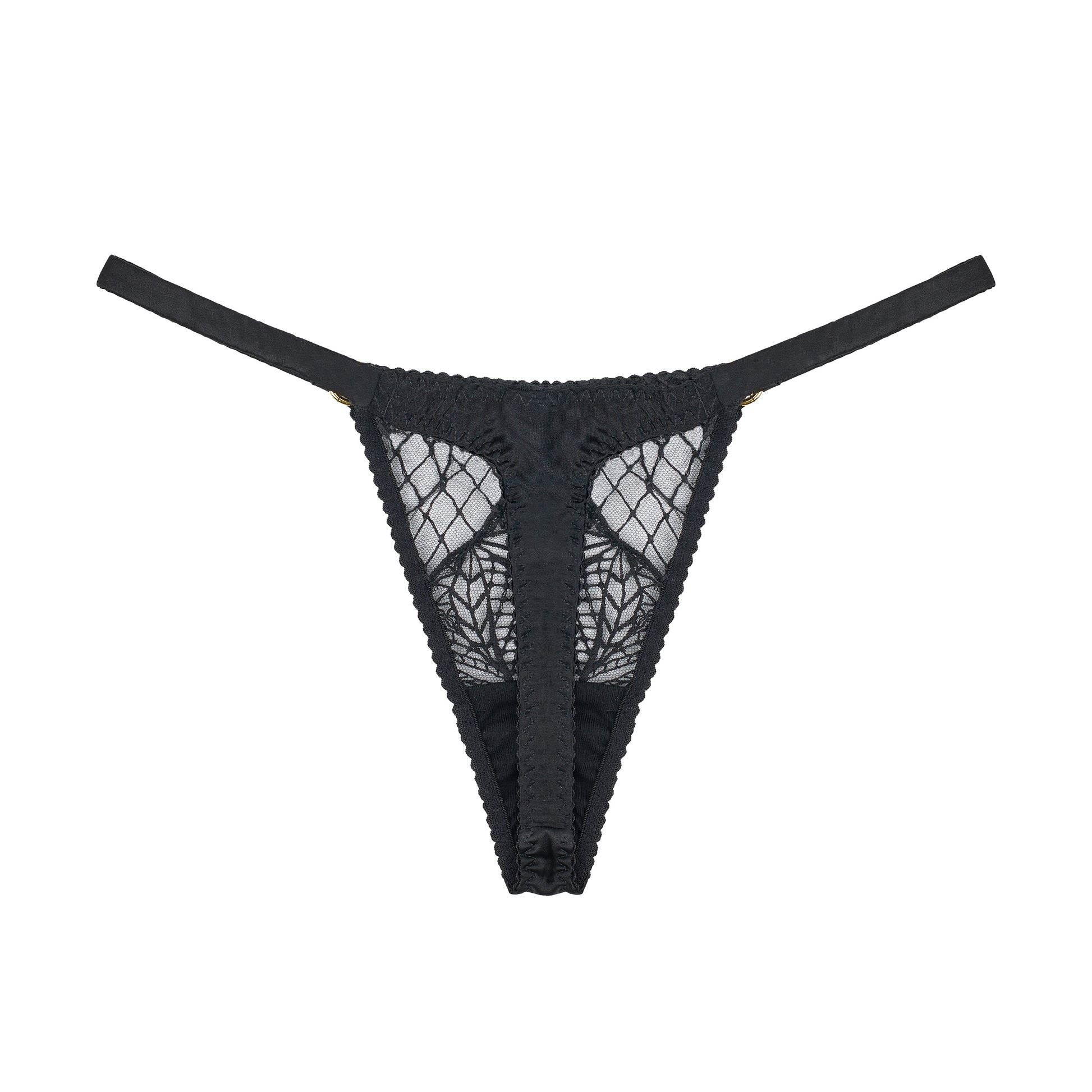 The Roxy collection is inspired by female confidence and strength, and the Roxy silk thong is no exception. Fleur of England's bestselling, high-leg thong silhouette is updated for the new season with sensual hand-drawn embroidery, designed by founder Fleur. The front of the garment features a mix of bespoke embroidery, paired with sensual Black silk, and 24-carat gold plated rings, for an opulent feel. The delicate side straps are crafted using elastic, encased in silk not only for a comfortable feel but also for a smooth silhouette. The back of the garment is crafted entirely from silk.