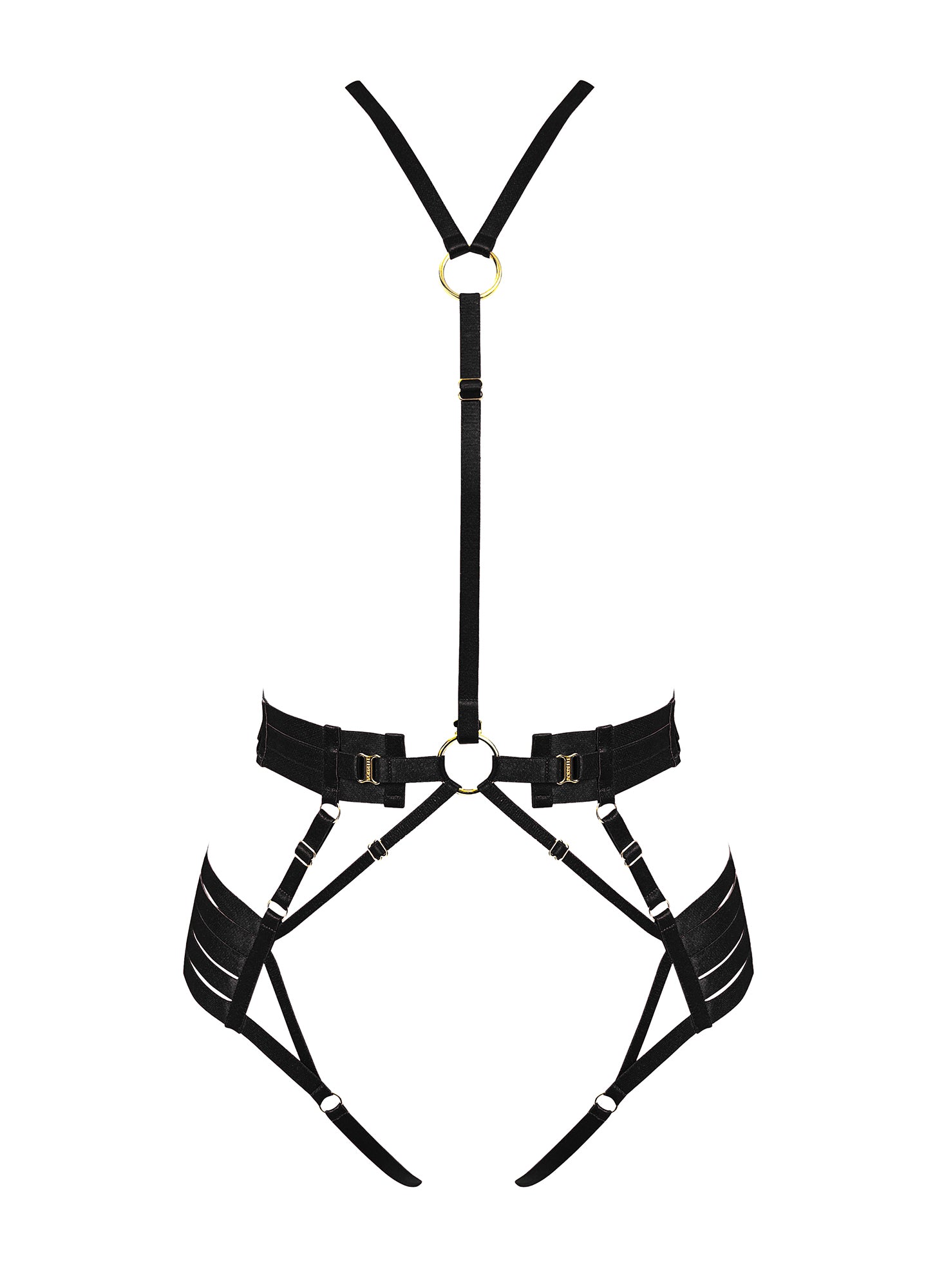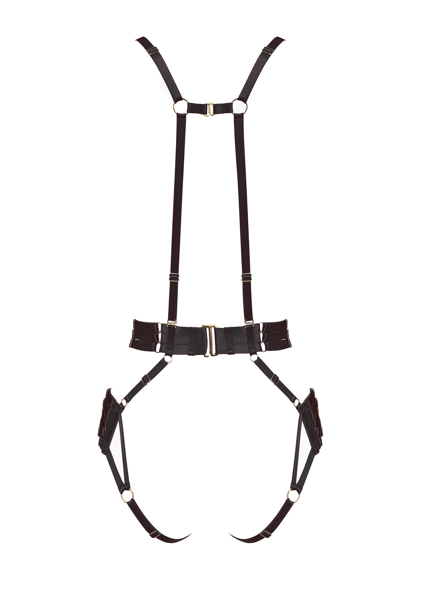 A bondage luxe body harness composed entirely of satin elastic strapping and 24k gold plated components. The detachable top harness allows the garment to be worn as a harness brief. Fully adjustable throughout, this style is perfect for styling and layering.