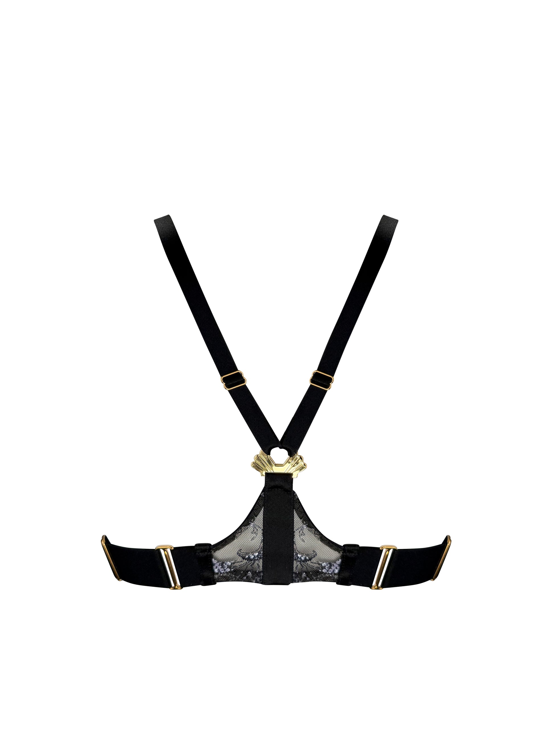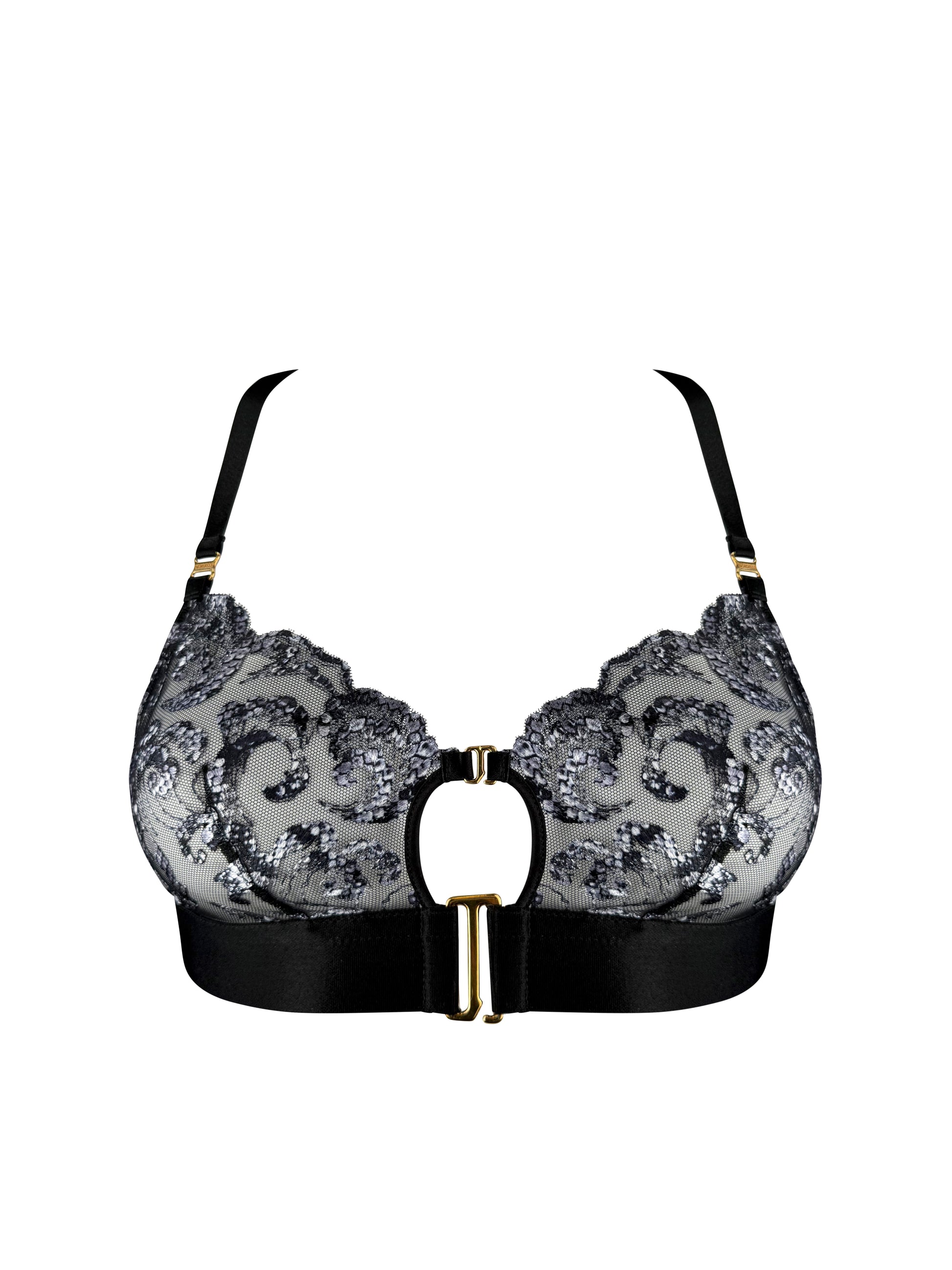 A lace soft cup bra which combines comfort with refined detail. Crafted with a soft wide band elastic underband for gentle support, this non-wired style prioritises wearability without compromising on design. A delicate panel of embroidered tulle is complete with a 24k gold plated shell component to elevate the back, while two swan hook fastenings at the front create a striking focal point.