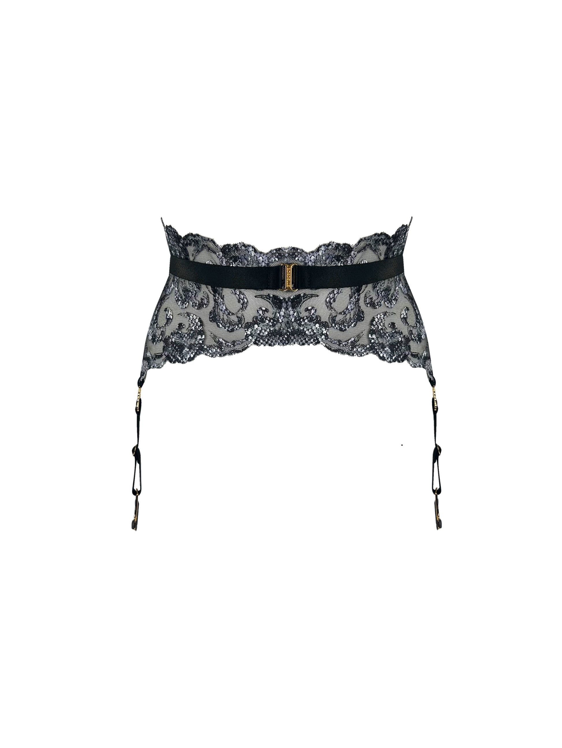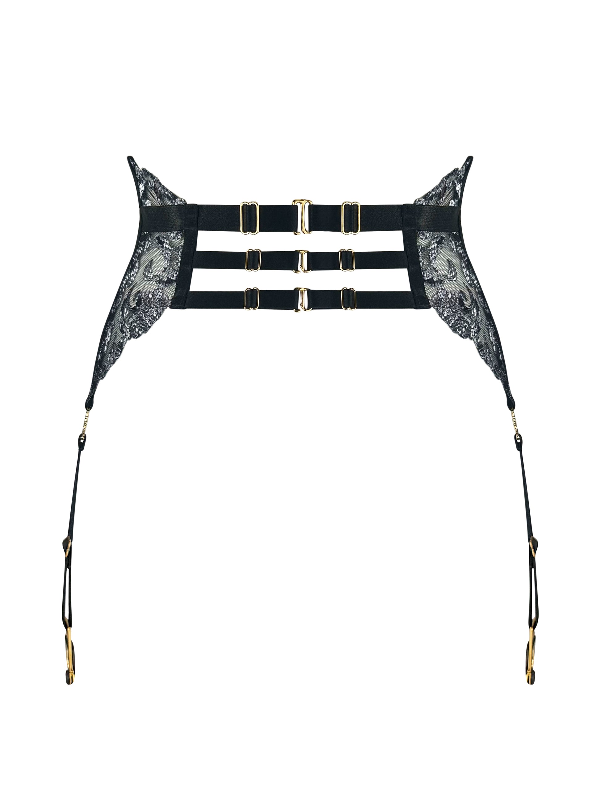 A four-strap suspender belt designed to accentuate the waist through the use of this season’s lace scallop edge. The 24k gold plated shell components accent the hips before extending into two suspender straps to wear with garters or stockings. Fastened with adjustable satin elastic strapping and swan hooks at the waist.