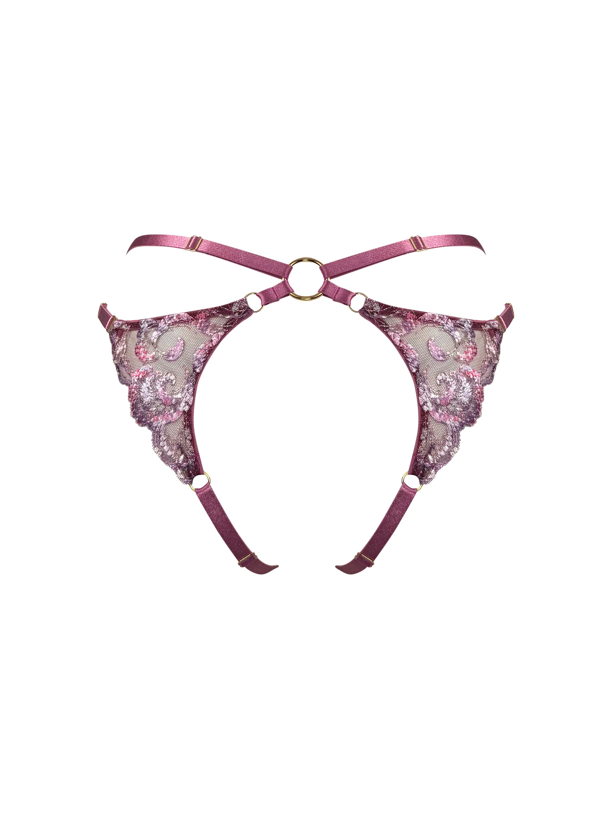 A bold statement in any lingerie look, this open back brief is crafted from bespoke embroidered tulle and satin elastic harness strapping. Lace panels frame the back, while 24k gold plated shell components add a touch of opulence to the front of this daring style.