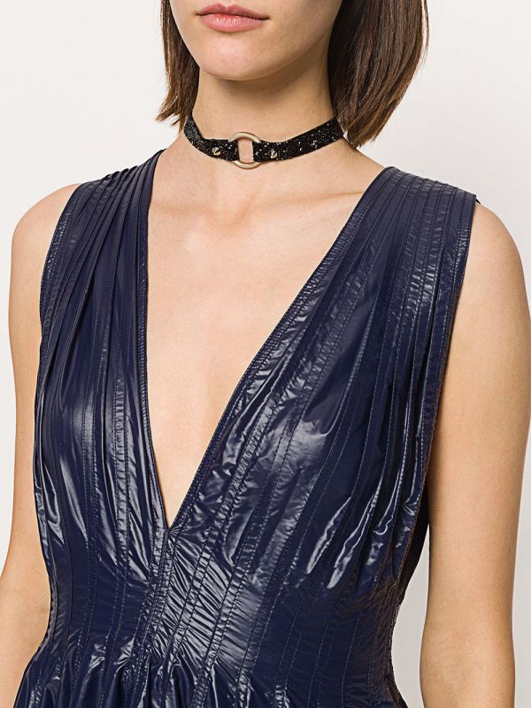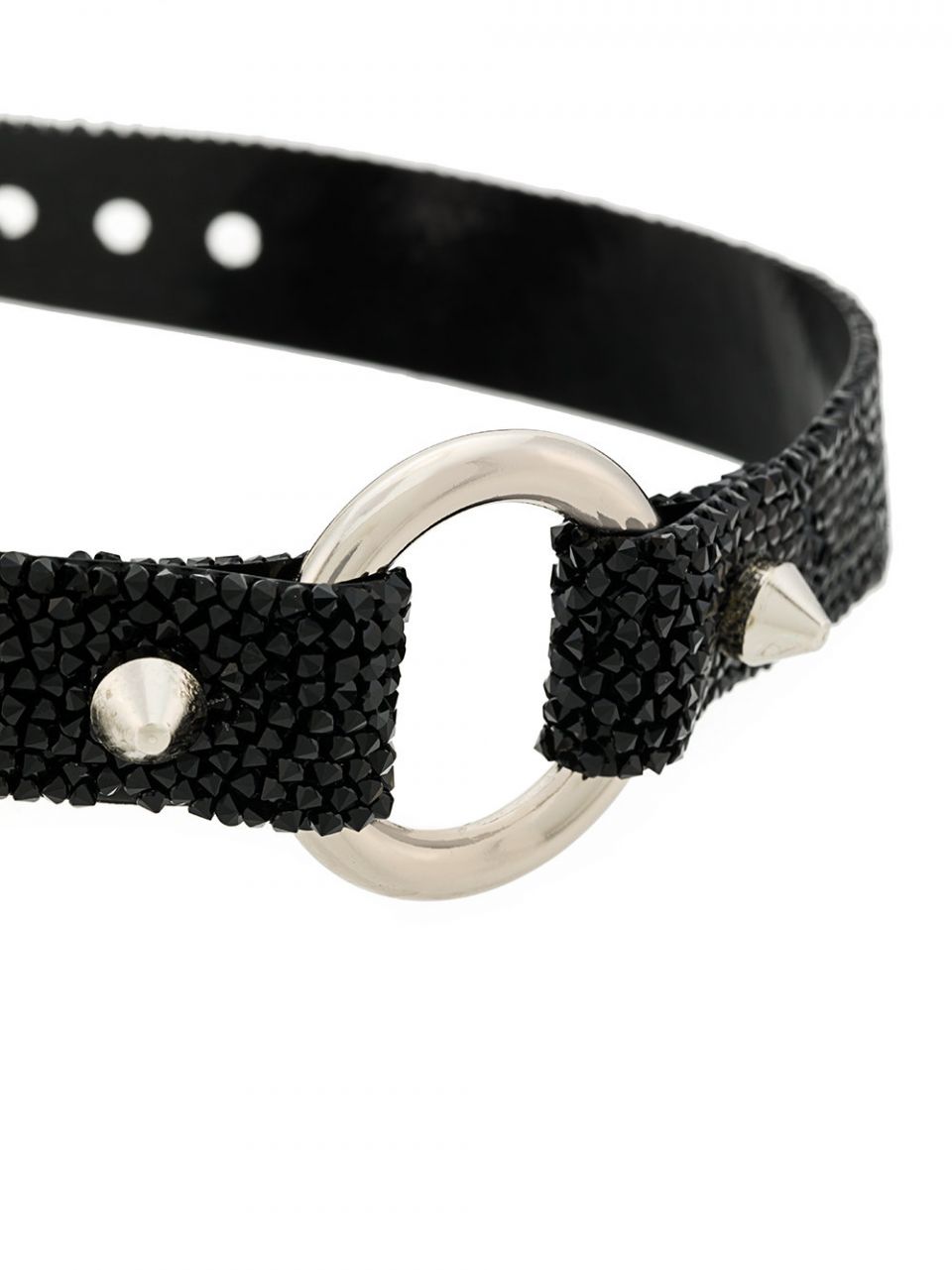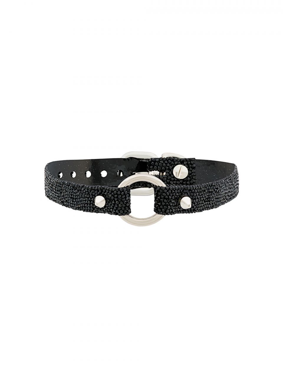 Made from Swarovski embedded fabric, this choker necklace is a unique piece of jewelry that is worn around the neck. The strap is fully adjustable and closes with a belted detail on the back. It shimmers continuously, especially at night. This choker is vegan.
