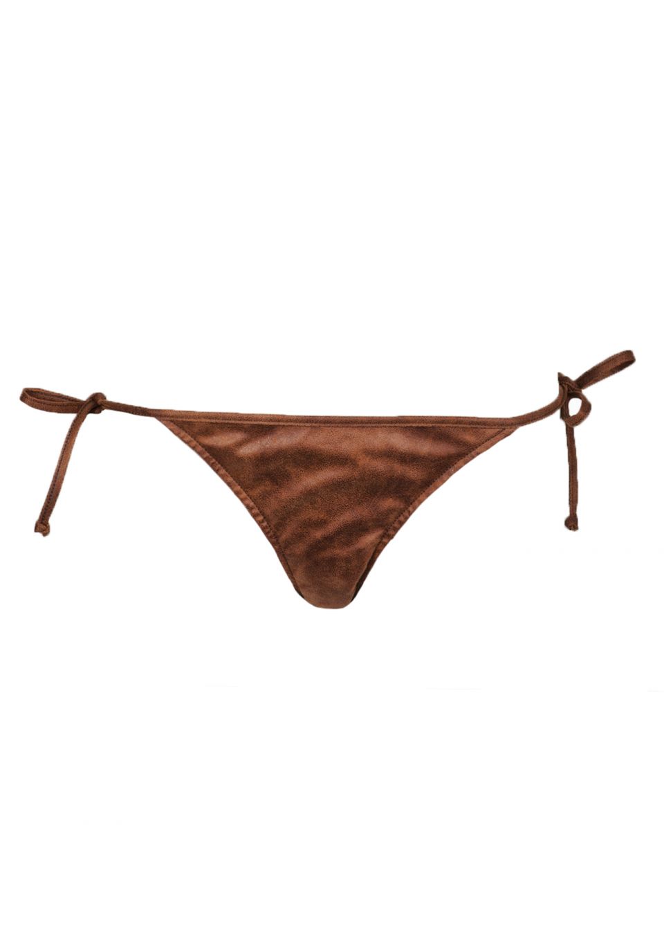 Slim-cut hipster tie-side bikini bottoms in a soft leather-look tan with flattering ruching detail at the centre back. Lined interoir.