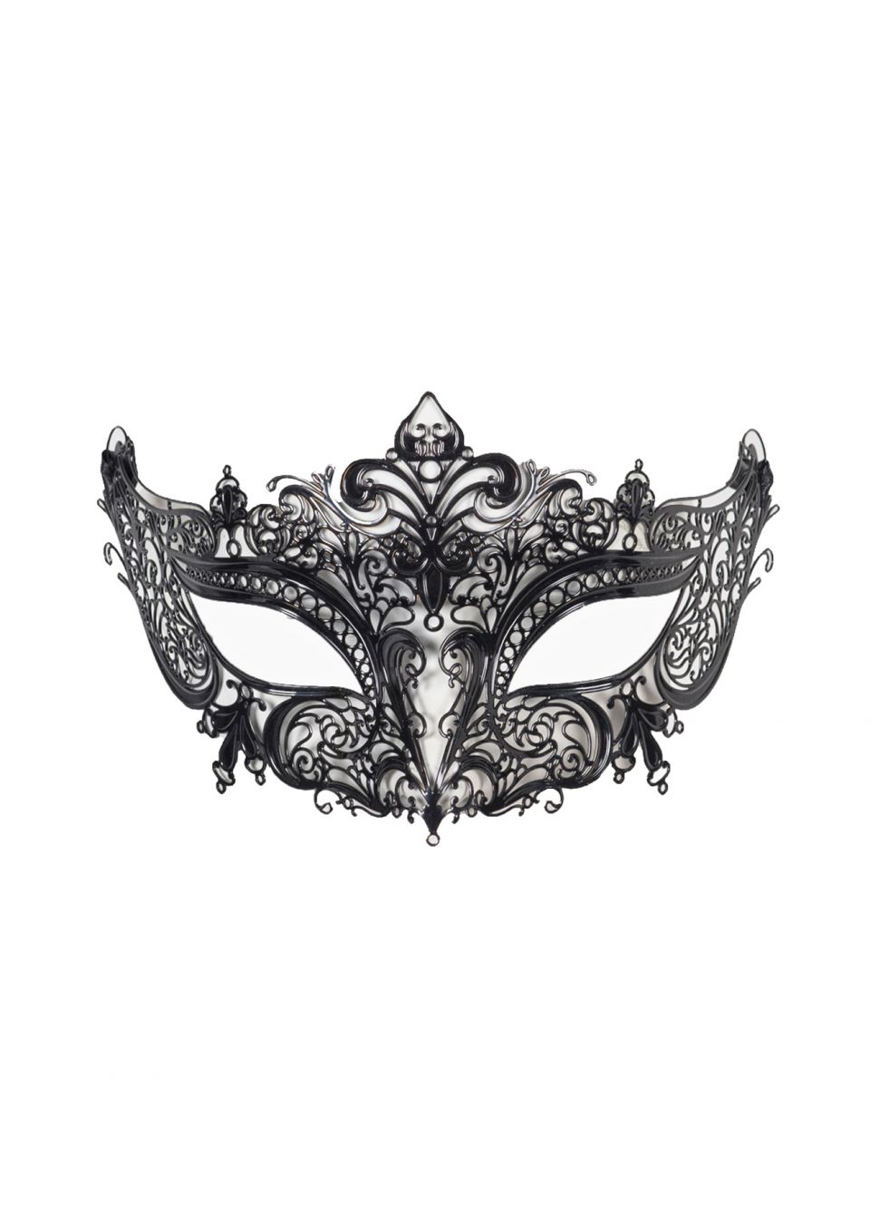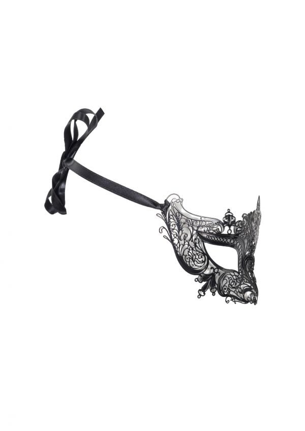 Stunning intricate metal eyemask which can be gently manipulated to fit your face perfectly. Black satin ribbons tie at the back of your head to keep the mask in place. Handcrafted in Italy.